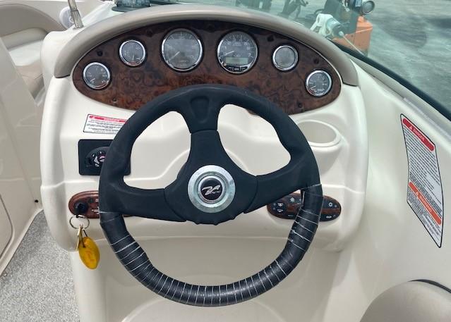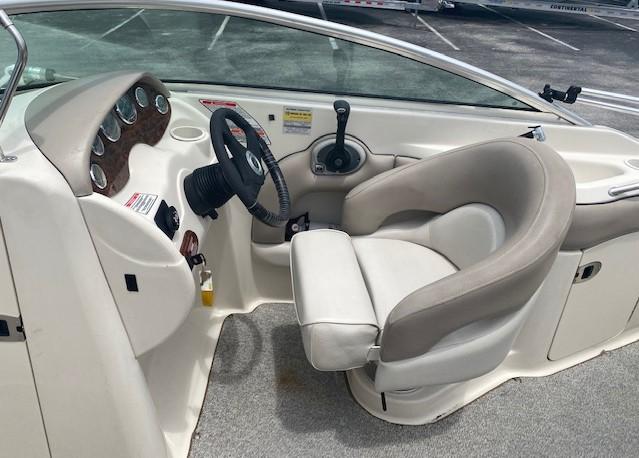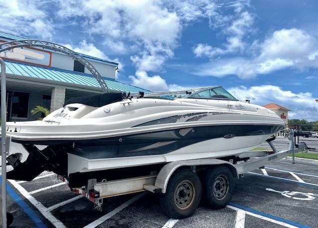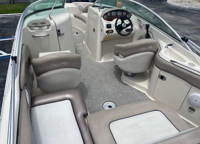 This 2004 220 Sundeck Sea Ray is in great working condition! It includes a starboard side entertainment center with sink and storage, a portside bucket seat that converts into a rear-facing sun lounger, a huge bow seating area for the whole family, and a fully enclosed head compartment with a lockable door. Other features included are navigation lights, a swim platform with a boarding ladder, cup holders, snap-in mat, a radio, baitwell, speakers, trim gauge, fuel gauge, bilge pump, and a bimini top.