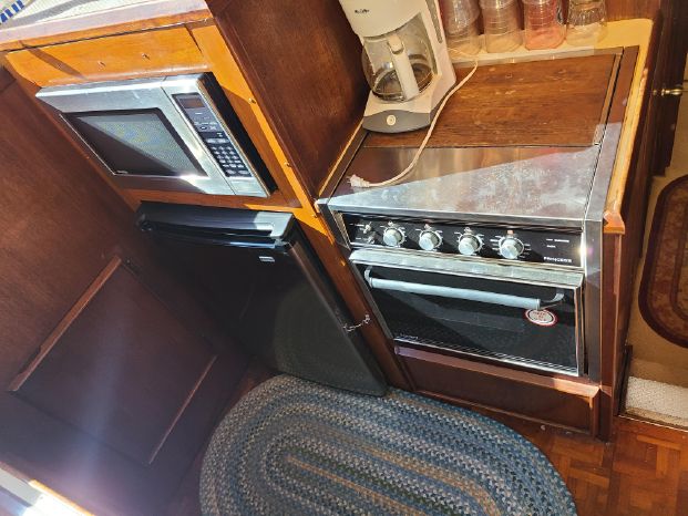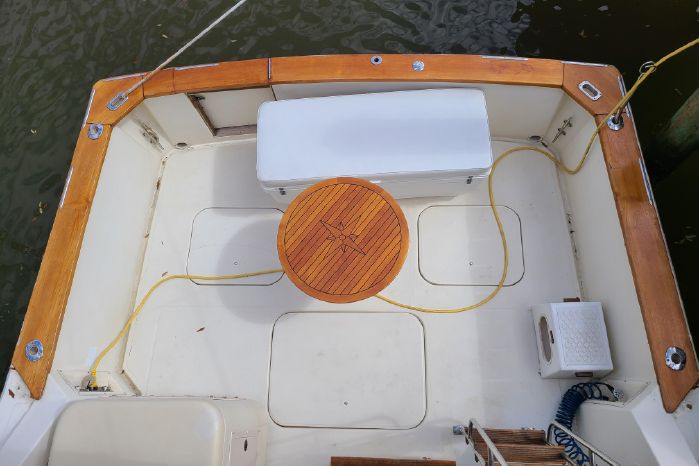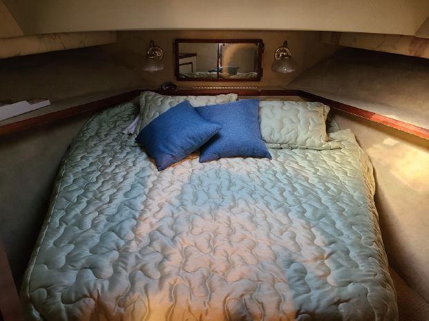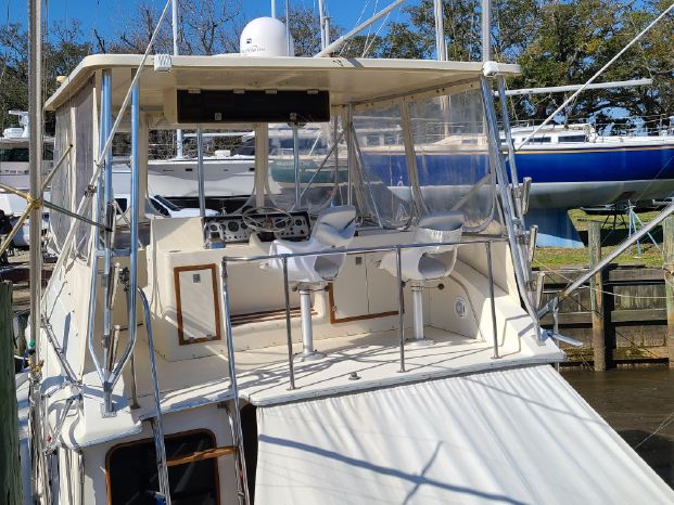 The Chris Craft 392 Commander is actually the old Uniflite 38 convertible dressed up in a more modern package. Chris Craft first marketed this boat in 1985 as the 382 Commander Sport Sedan - basically the late Uniflite 38 with a new name. The following year (1986) Chris Craft engineers redesigned the deckhouse and flybridge resulting in a much-improved profile. While the Chris 392 is light years ahead of the old Uniflite in appearance and decor, the well-known seakeeping properties of the original hull have been retained. The cockpit is large enough for a fighting chair, side decks are wide, and the bridge is arranged with bench seating forward of the helm. Beginning forward most is a bow anchor rode storage locker; next aft is the master stateroom fitted with a queen-size berth with storage compartment and drawers beneath, port and starboards small storage lockers, and a large hanging locker to starboard; master stateroom has a carpeted floor and side hull liner. Starboard side aft of the master stateroom is the guest stateroom fitted with upper and lower bunks and a large hanging locker. Portside aft of the master stateroom is a water closet with linoleum flooring, fitted with a toilet, shower stall, and lavatory/vanity. Centerline and up steps from the forward accommodation spaces and set to port is the galley with oak parquet flooring. Stepping up and aft of the galley above the engine room is the salon; starboard side forward salon is the AC and DC ships service electrical distribution panels. The salon is fitted with L shaped sleeper sofa, centerline aft most is the exit door to the cockpit.