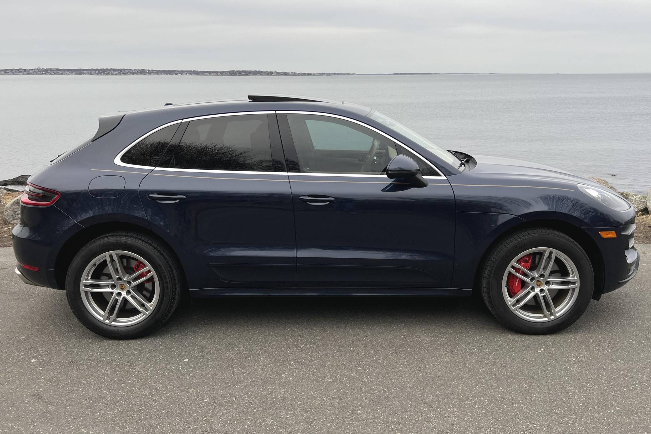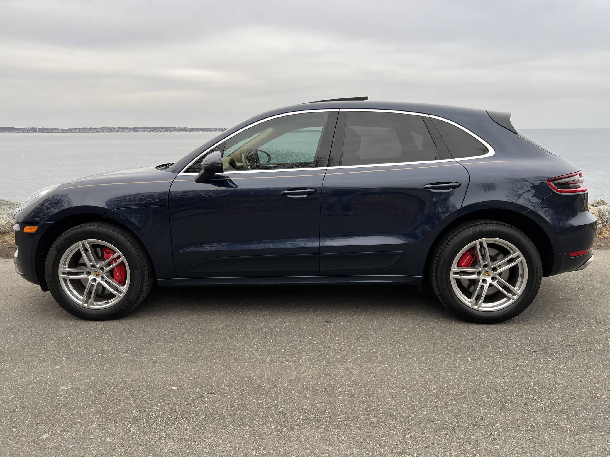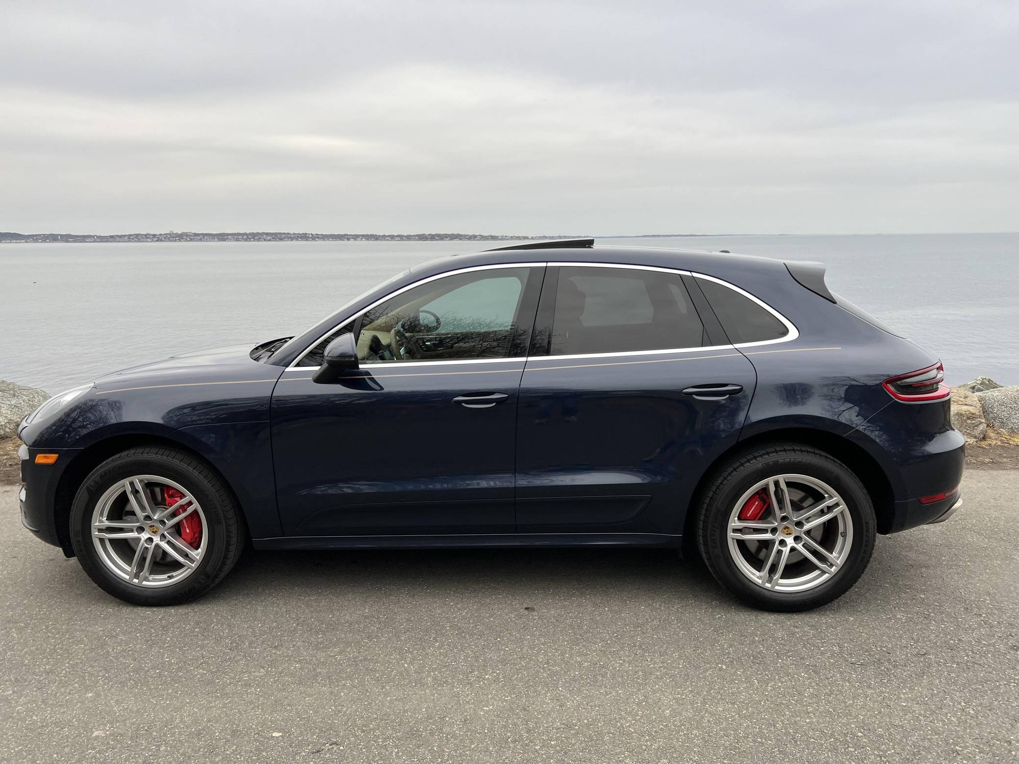 2015 Porsche Macan Turbo, finished in Dark Blue Metallic with a Luxor Beige interior. A build sheet is provided in the photo gallery, and a partial list of notable equipment includes the Premium Package Plus, the Sport Chrono, Comfort Lighting, and Carbon Fiber Interior packages, 19-inch Macan Turbo wheels, leather upholstery, power-adjustable, heated, and ventilated front seats, a navigation system, a Bose surround sound system, and more as detailed below. Modifications reported by the seller are limited to side pinstripes, tinted windows, and an Escort Passport 9500ci radar detector. Encouraged by the Cayenne's success and eager to tap into one of the biggest segments of the market, Porsche introduced the Macan as its entry-level SUV for 2015. Some of the model's underpinnings came from Audi, but Porsche dialed in a level of performance and handling that's unusual to find in a compact SUV. The Turbo model was positioned at the top of the line-up through the 2021 model year. Power comes from a turbocharged 3. 6-liter V6, rated at 400 horsepower and 406 lb-ft of torque. It spins the four wheels via a 7-speed dual-clutch automatic transmission.
