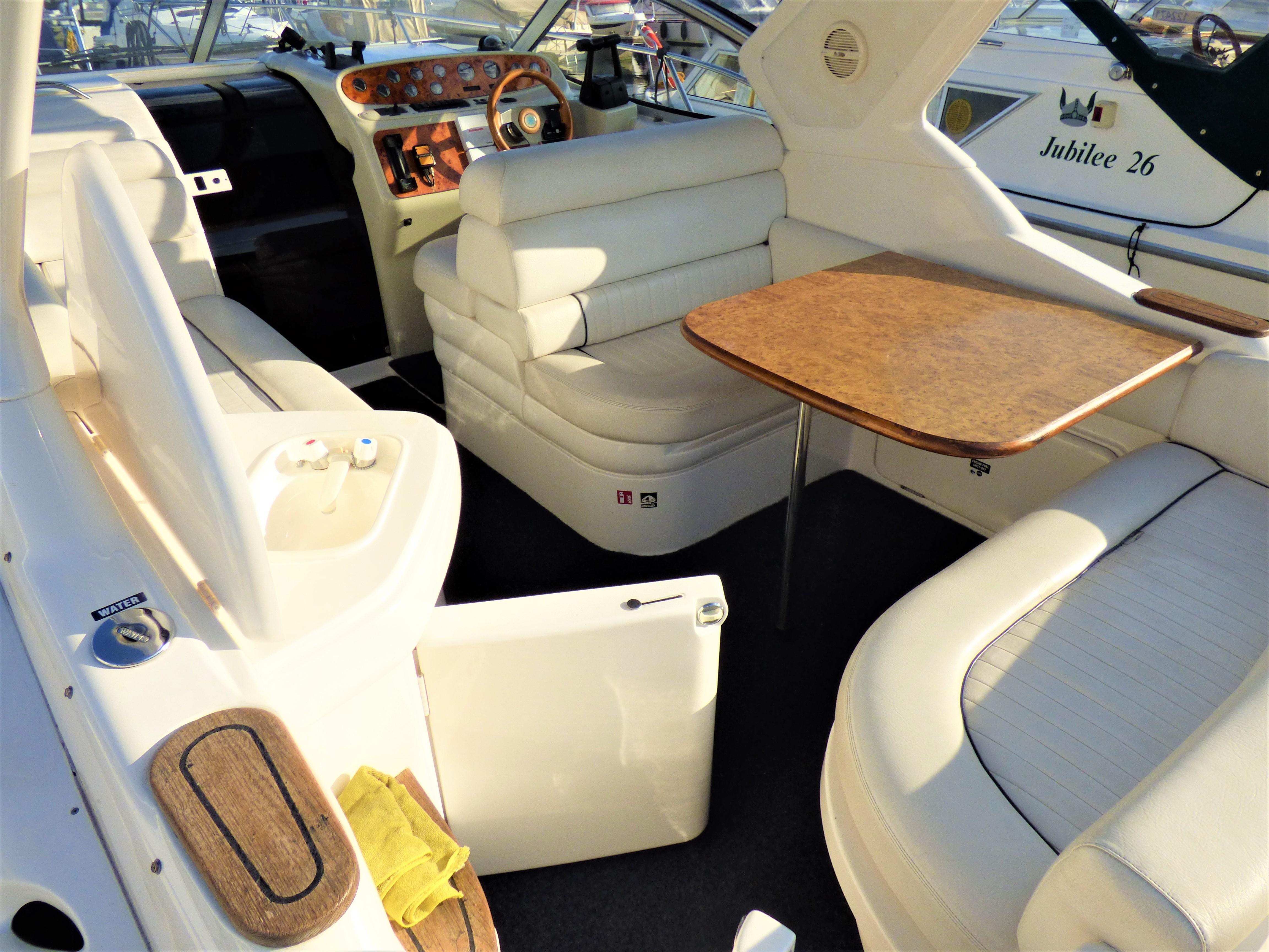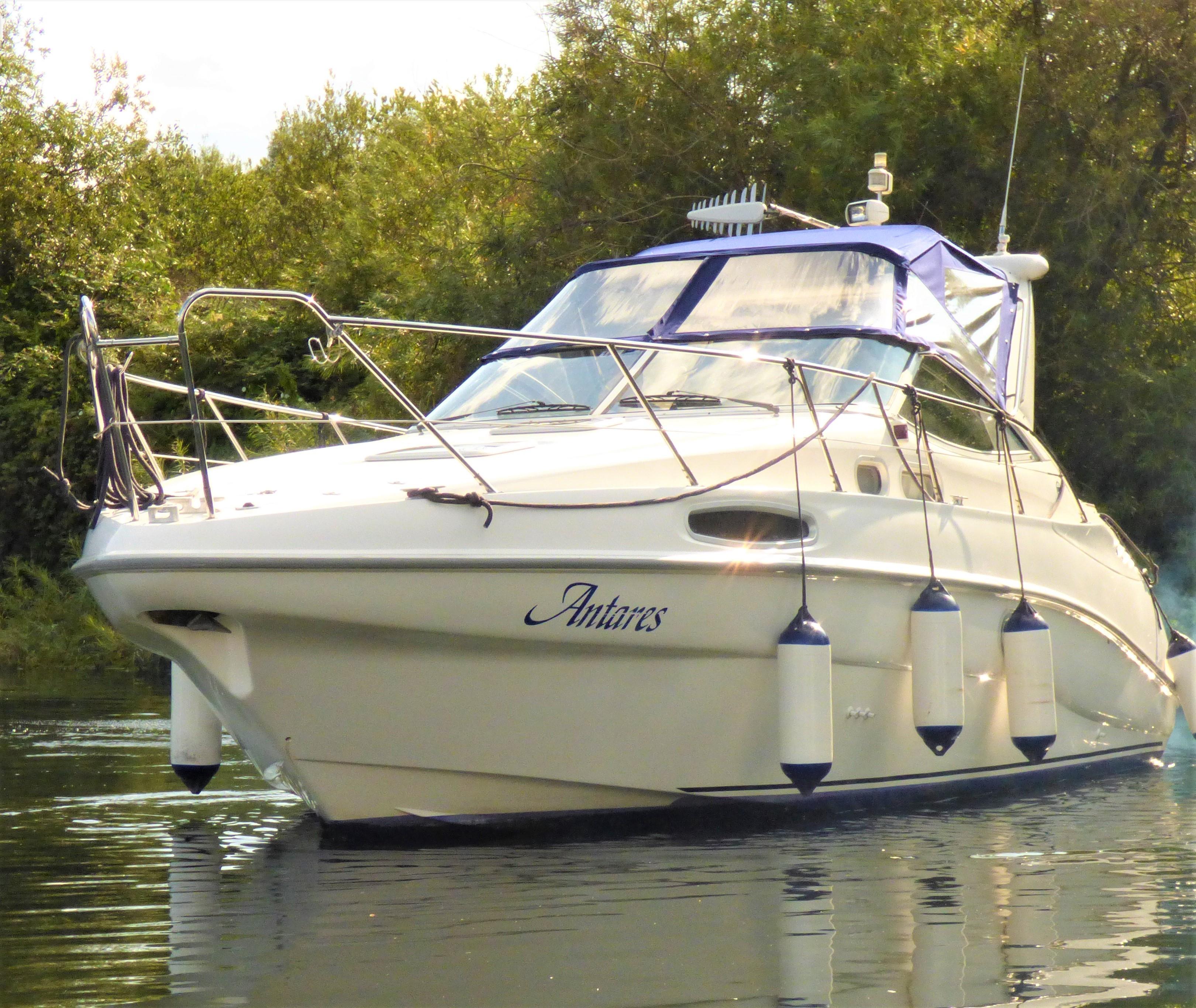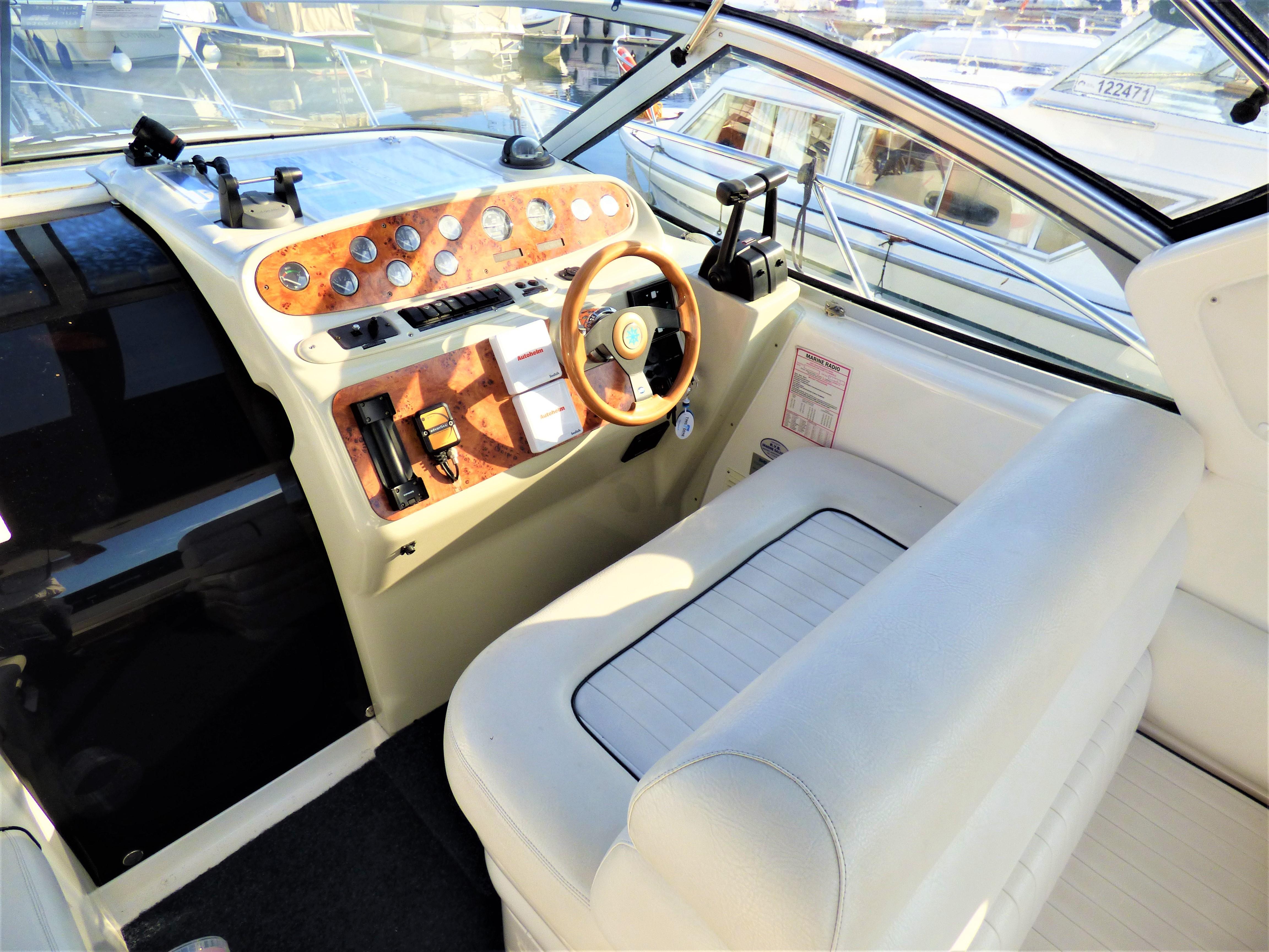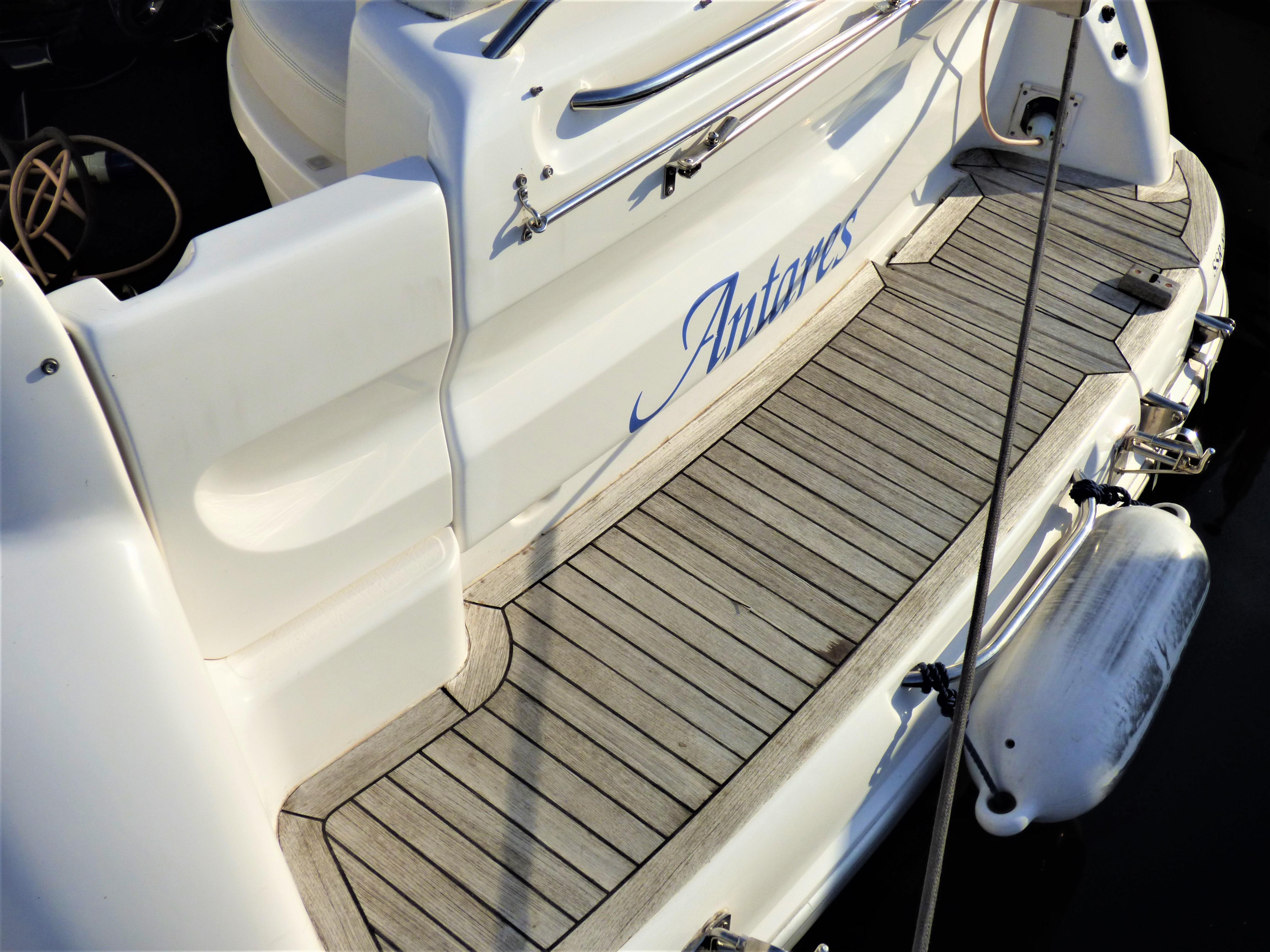 This is a superbly presented 28 feet vessel. Factory fitted options include: VHF, Oven & Grill, Radio cassette & 4 speakers, Heating, Remote control spotlight, cockpit Fridge, Cockpit carpet, Teak Bathing Platform, Snap Davits, Recent Works / Upgrades include Annual Full Service to Drives & Engines, 2019 – New Engine Batteries, New canopy, Victron 1600w inverter, Victron Multiplus charger, New Propellers.