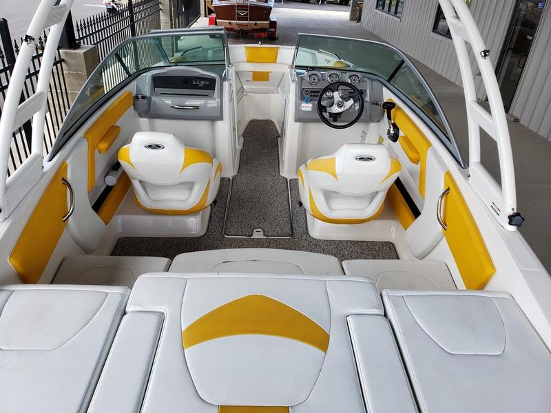 Beautiful 2014 Chaparral H20 21 Sport has a white and yellow exterior, a white and yellow interior, and mixed grey snap-in carpet. It comes equipped with a Jenson stereo system with massive Memphis Audio speakers and a Bbox subwoofer, white tower with towing capabilities, and 4 tower speakers, massive sun pad, swim platform with swim ladder, bow anchor storage, a tandem axle Chaparral trailer with a spare tire, and much, much more!