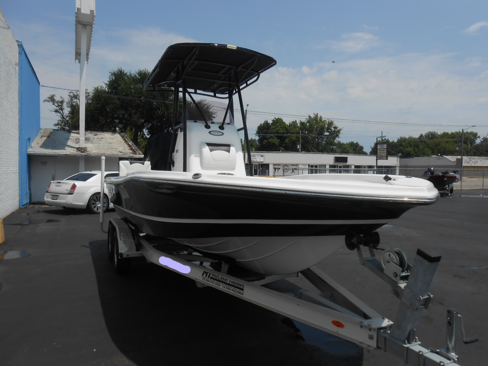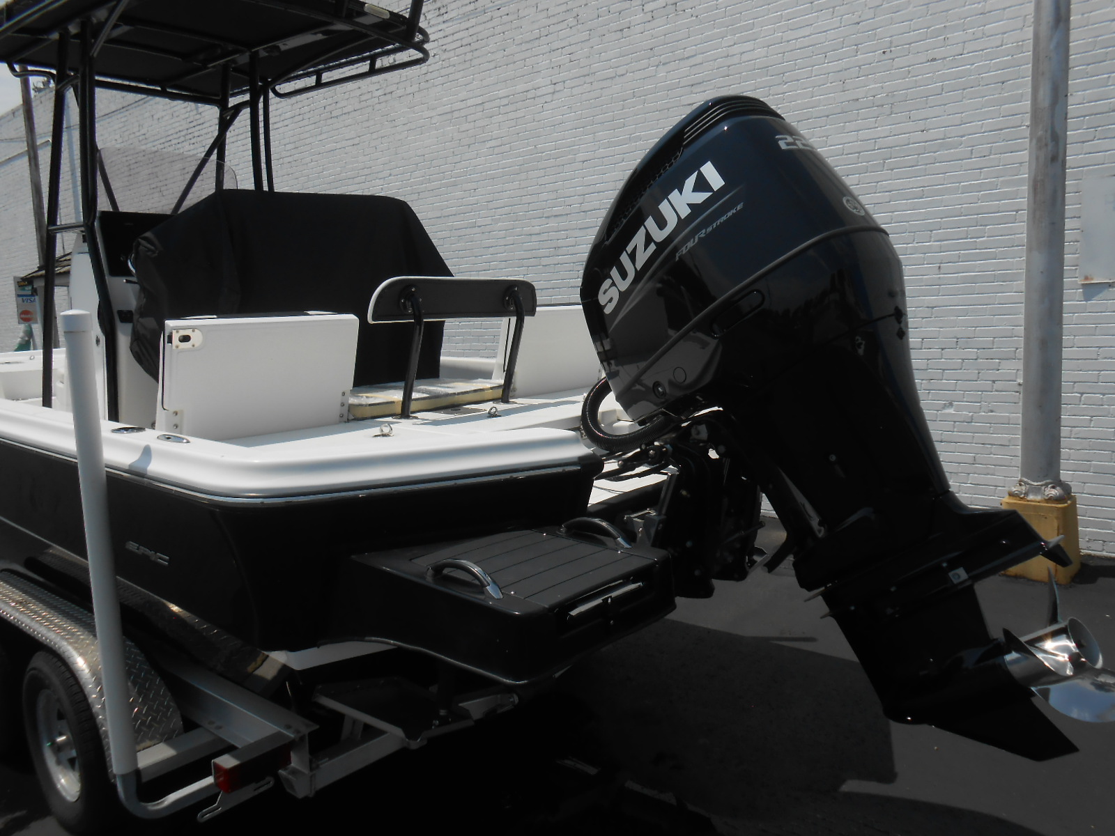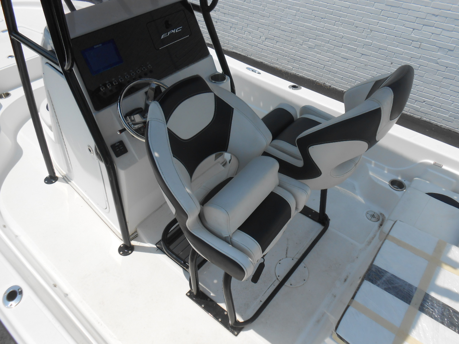 2019 Epic E2 Bay 24 center console equipped with Suzuki 225 hp 4 strokes outboard motor. Boat includes rear ladder, Livewell, hydraulic steering, rod storage, Lenco trim tabs, hydraulic jack plate, T-top tower with bimini, wind guides, bolster seats, depth finder, LED courtesy lights, retractable cleats, and tandem axle trailer with LED lights and brakes. 8 person capacity.