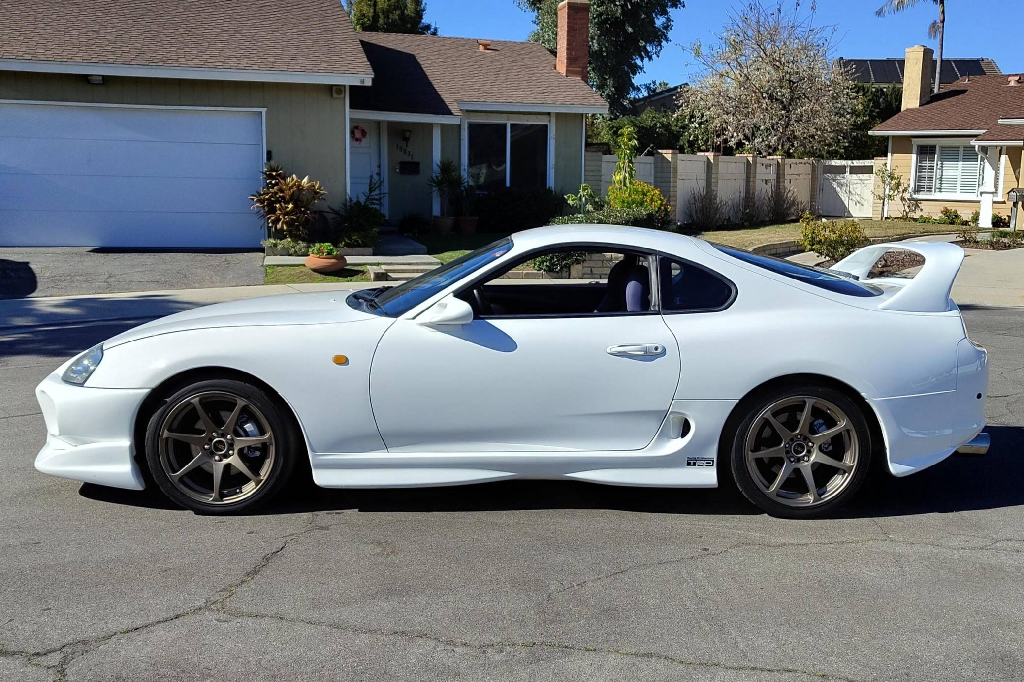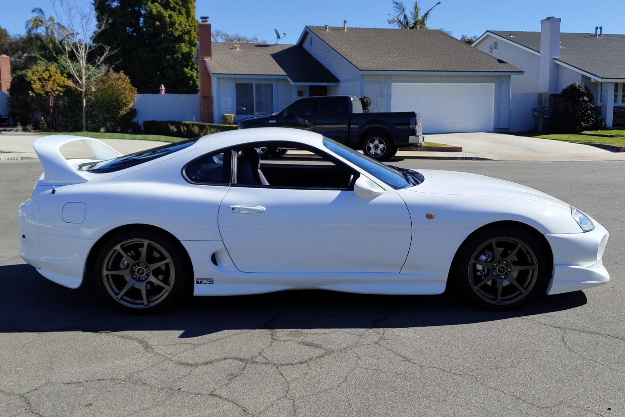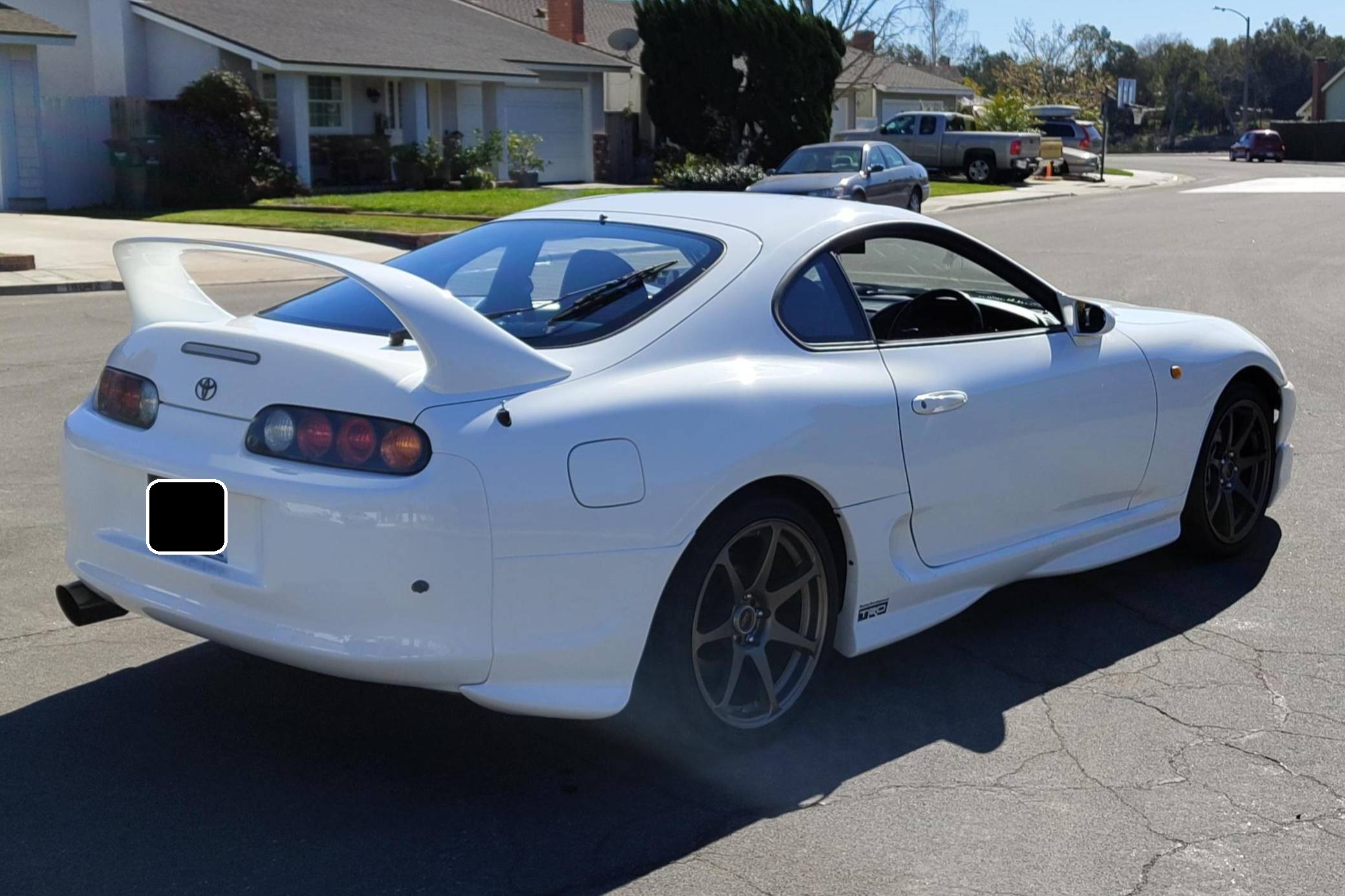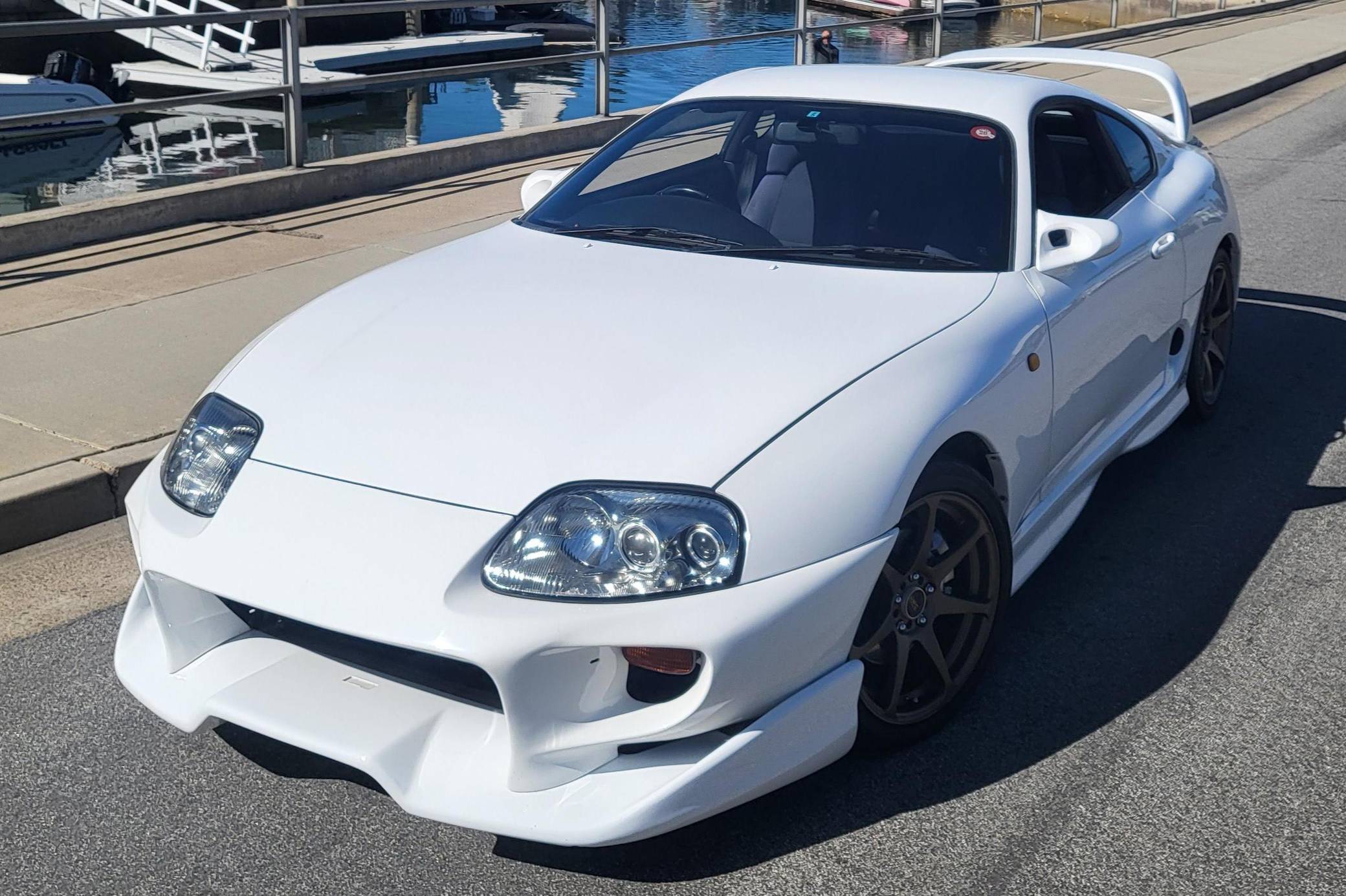 THIS. . . is a 1996 Toyota Supra, finished in white with a blue and black interior. Reportedly imported in 2022, it's equipped with a metric instrument cluster and its odometer displays about 107,700 kilometers, which represents approximately 67,000 miles. Modifications reported by the seller include a twin-disc clutch kit, 18-inch CST ZERO 1 wheels, a VeilSide C-II front bumper, TRD side skirts, a MOMO steering wheel, and a Carrozzeria head unit. Launched for 1994, the fourth-generation Supra (called "A80" internally) was celebrated as one of Toyota's best sports cars even before it earned a starring role in the Fast & Furious franchise. It offered performance that rivaled much more expensive cars and the reliability expected from a Toyota. Production ended in 2002, and the nameplate was consigned to the automotive attic until the BMW-based model arrived in 2019. Power comes from a 3. 0-liter straight-6, rated at about 220 horsepower and 210 lb-ft of torque. Called "2JZ-GE" internally, it spins the rear wheels via a 5-speed manual transmission.