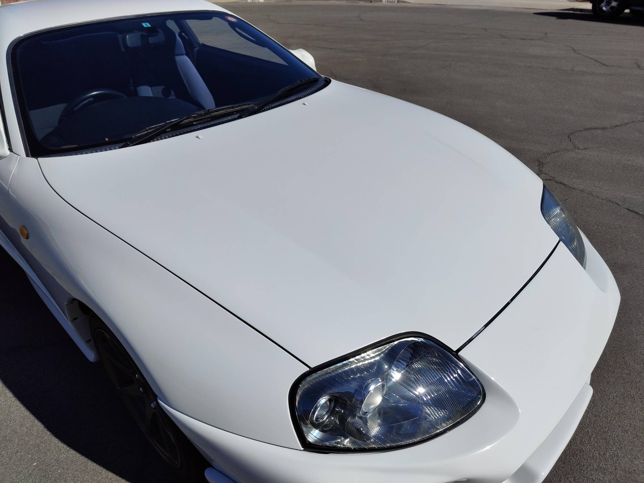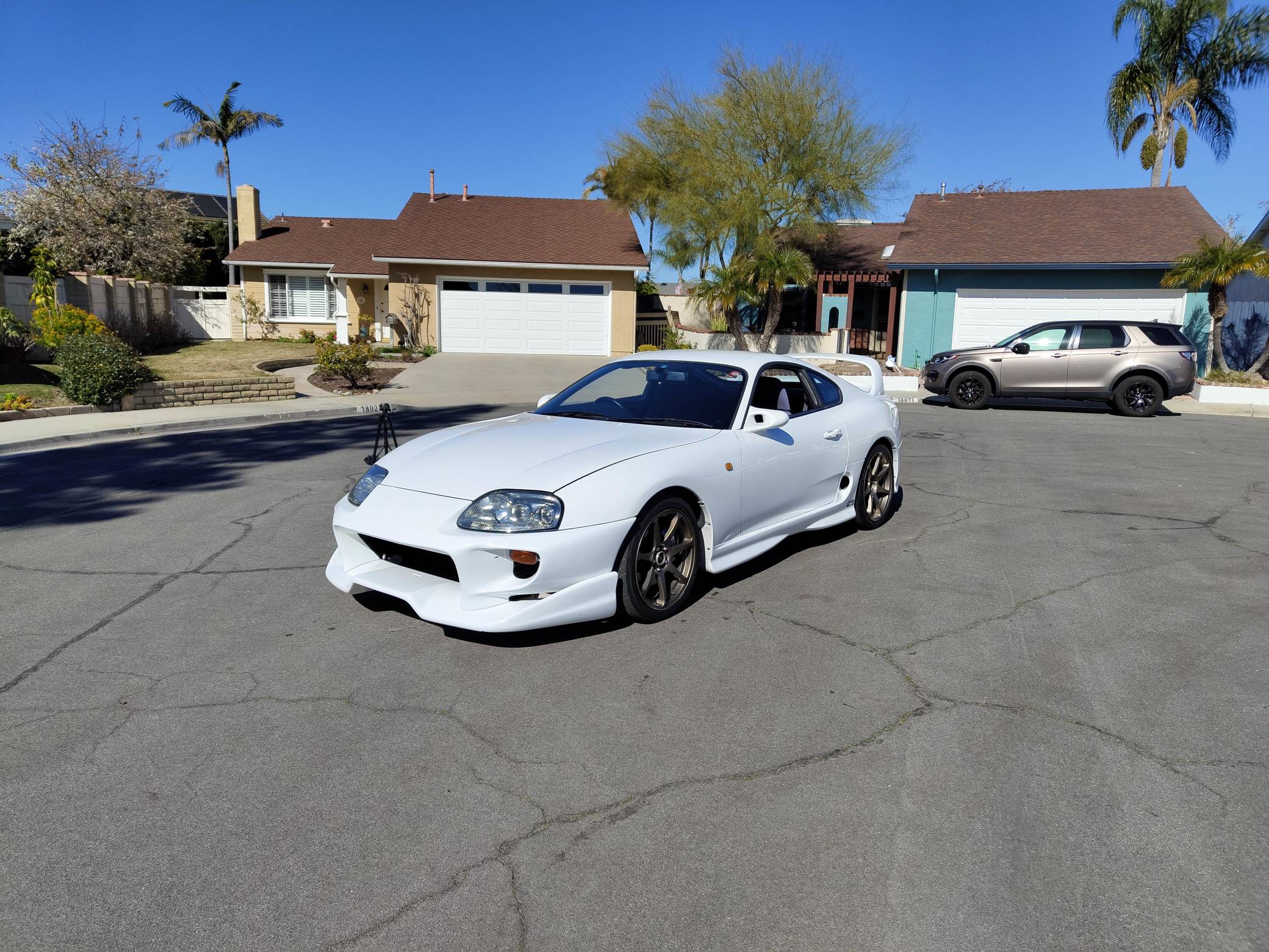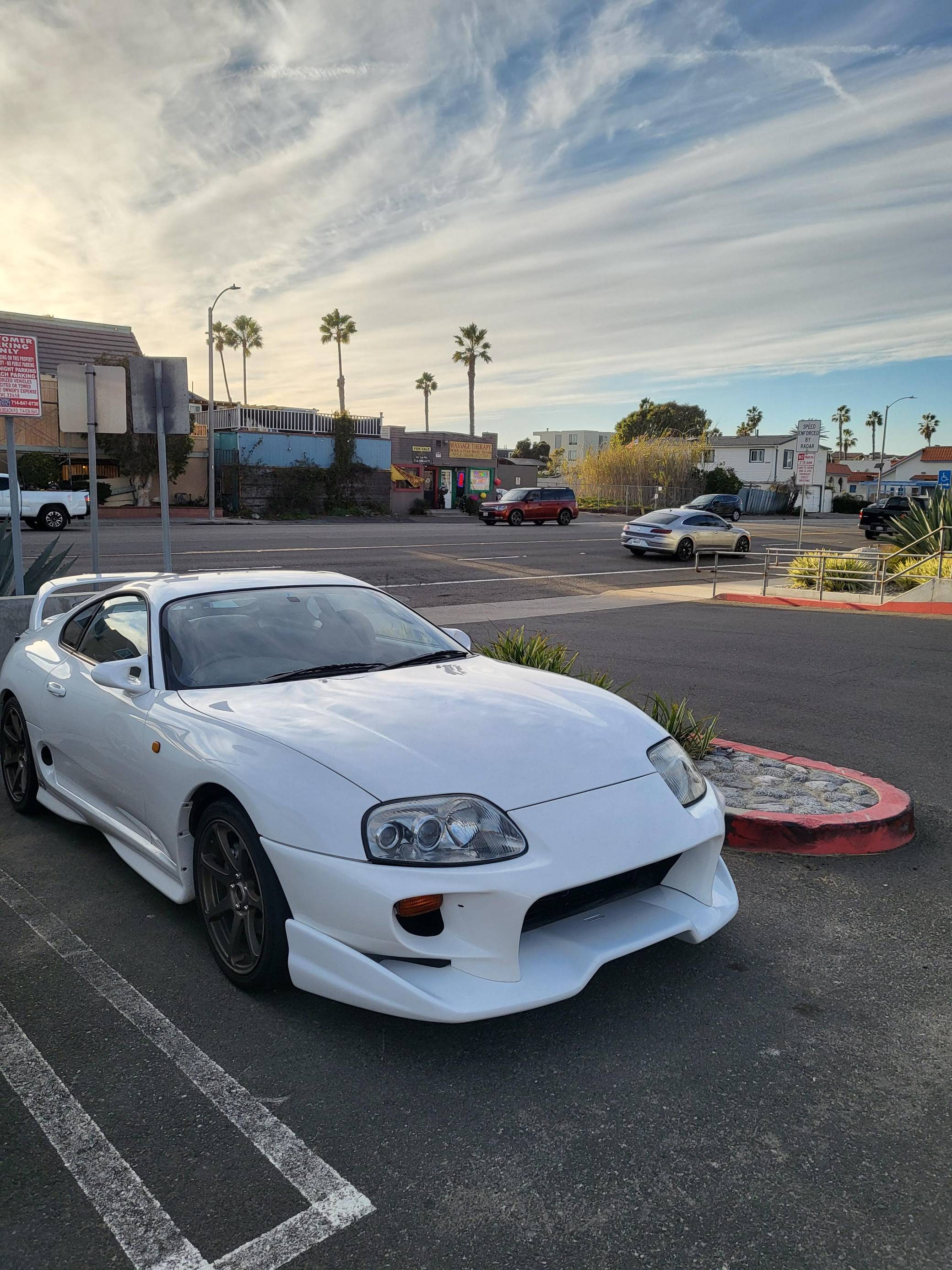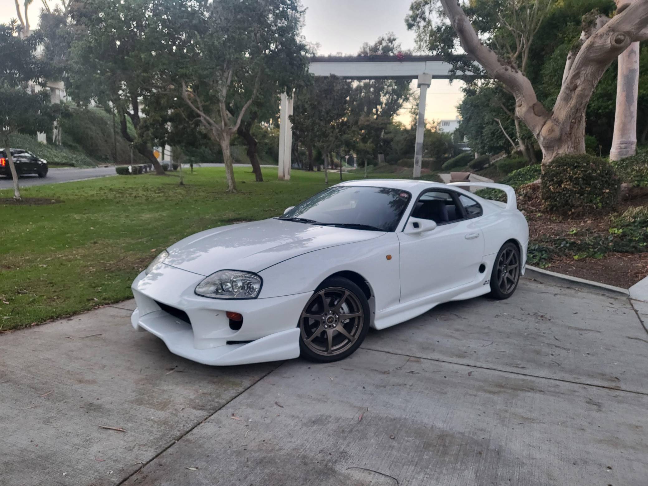 THIS. . . is a 1996 Toyota Supra, finished in white with a blue and black interior. Reportedly imported in 2022, it's equipped with a metric instrument cluster and its odometer displays about 107,700 kilometers, which represents approximately 67,000 miles. Modifications reported by the seller include a twin-disc clutch kit, 18-inch CST ZERO 1 wheels, a VeilSide C-II front bumper, TRD side skirts, a MOMO steering wheel, and a Carrozzeria head unit. Launched for 1994, the fourth-generation Supra (called "A80" internally) was celebrated as one of Toyota's best sports cars even before it earned a starring role in the Fast & Furious franchise. It offered performance that rivaled much more expensive cars and the reliability expected from a Toyota. Production ended in 2002, and the nameplate was consigned to the automotive attic until the BMW-based model arrived in 2019. Power comes from a 3. 0-liter straight-6, rated at about 220 horsepower and 210 lb-ft of torque. Called "2JZ-GE" internally, it spins the rear wheels via a 5-speed manual transmission.