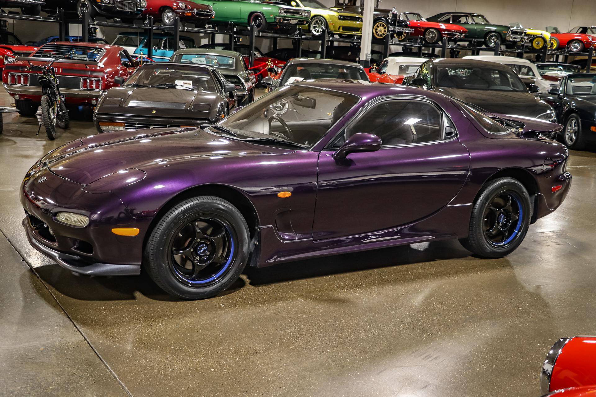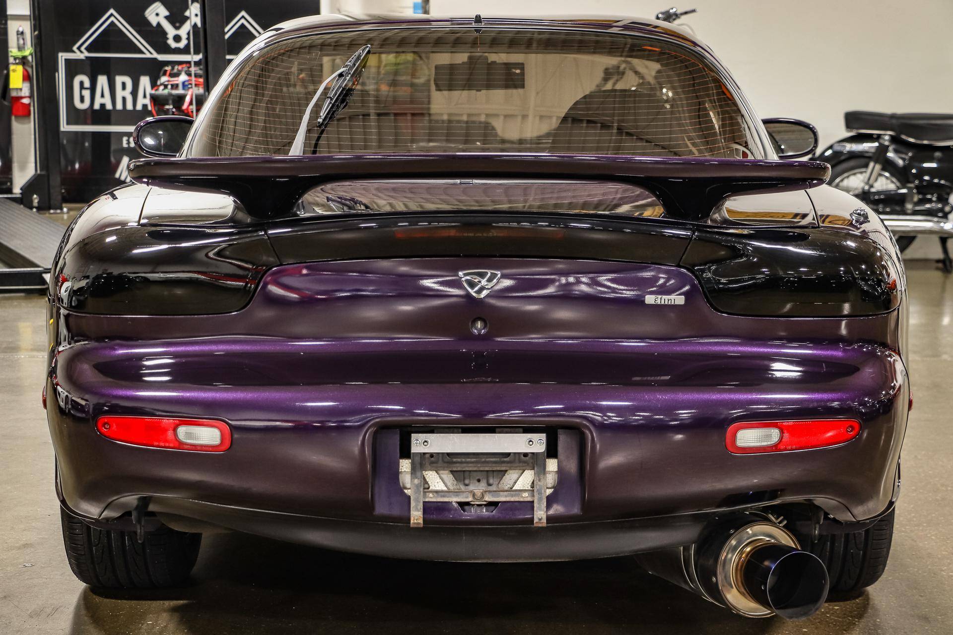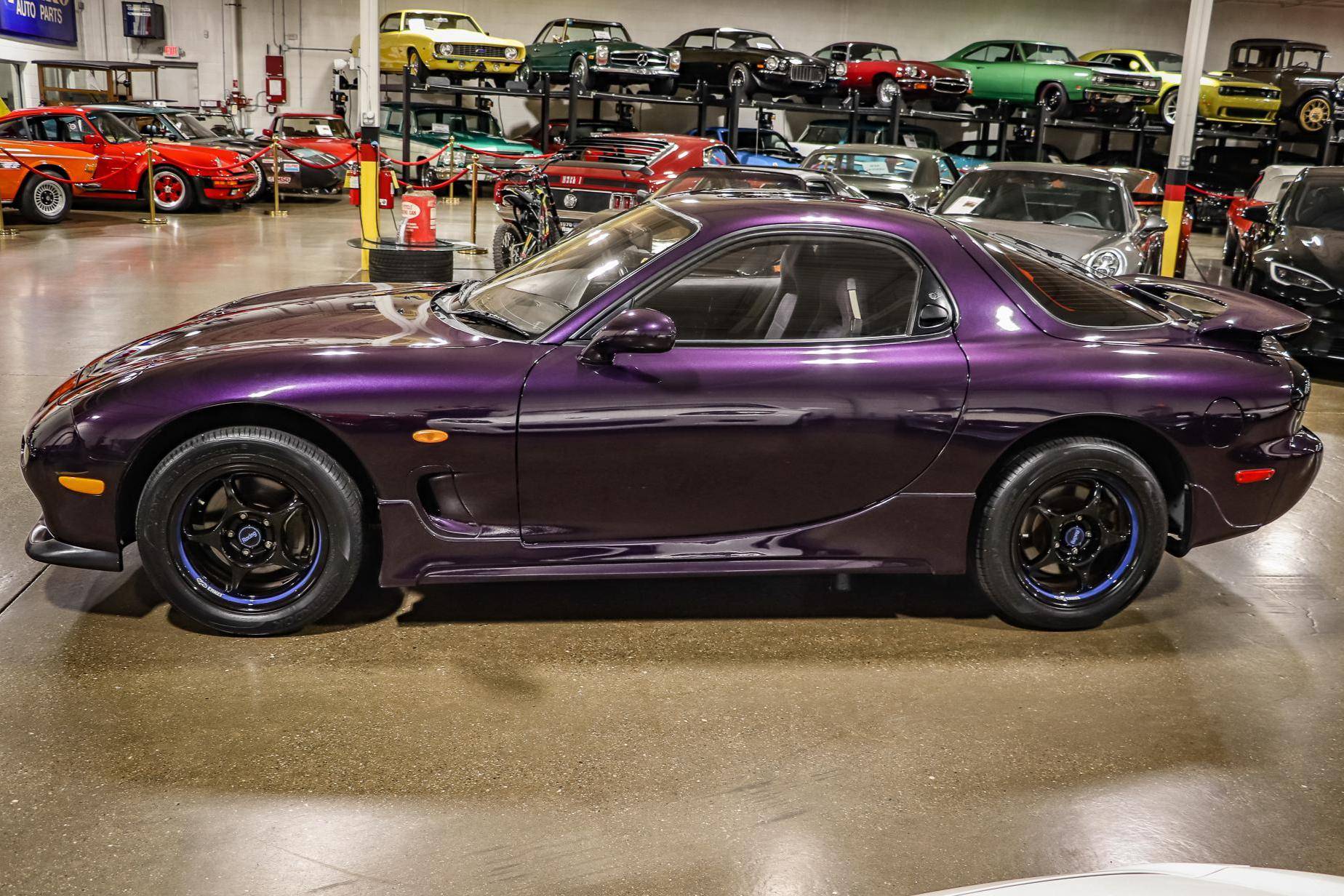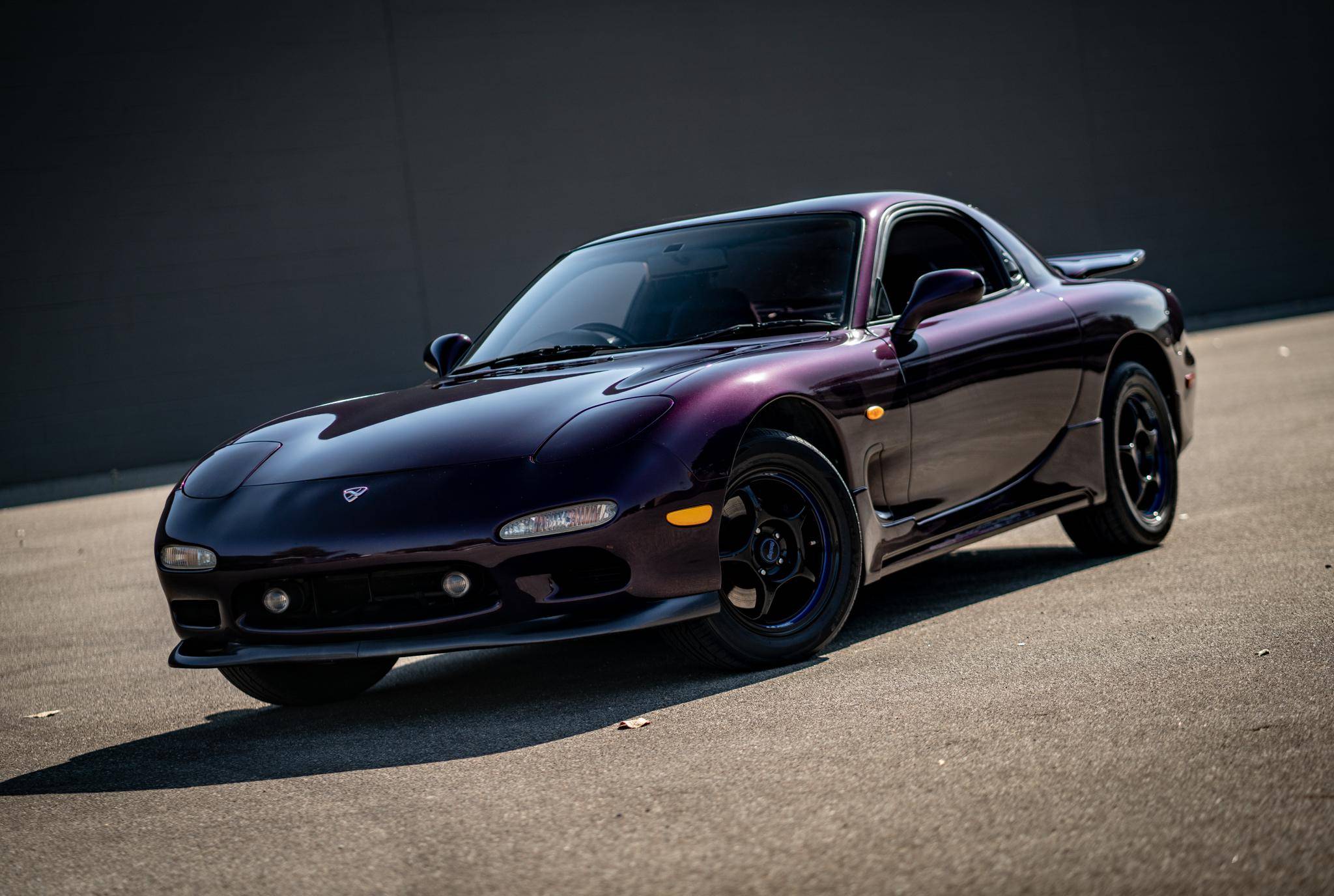 THIS. . . is a 1994 Mazda Efini RX-7 Type R, finished in Violet Pearl with a black interior. It's equipped with a metric instrument cluster, and its odometer displays approximately 26,400 kilometers, which represents about 16,400 miles. The Japanese Car VX vehicle history report provided in the gallery shows no accidents or mileage discrepancies in this car's past. Factory equipment includes a front strut tower brace, pop-up headlights, suede upholstery, power windows, mirrors, and locks, and air conditioning. Modifications reported by the seller include an aftermarket cat-back exhaust, TEIN coilovers, purple exterior paint, 16-inch Enkei wheels, and a Pioneer head unit. Mazda's third-generation RX-7 debuted in Japan for the 1992 model year, and it was praised by enthusiasts and by journalists as a significant improvement over its predecessor. Its more fluid lines aligned it with the design trends of the 1990s, and the twin-turbocharged Wankel engine gave it Porsche-like performance without the price tag. The ɛ̃fini brand represented Mazda's luxury division of vehicles that were offered only in Japan from 1991 to 1997. The RX-7 Type R was the lightweight and sportier version of the famed sports car model, and it was slotted in the middle of the Japanese market RX-7 range. Power comes from a twin-turbocharged 1. 3-liter twin-rotor Wankel engine, rated at 252 horsepower and 217 lb-ft of torque. Output is sent to the rear wheels via a 5-speed manual transmission.