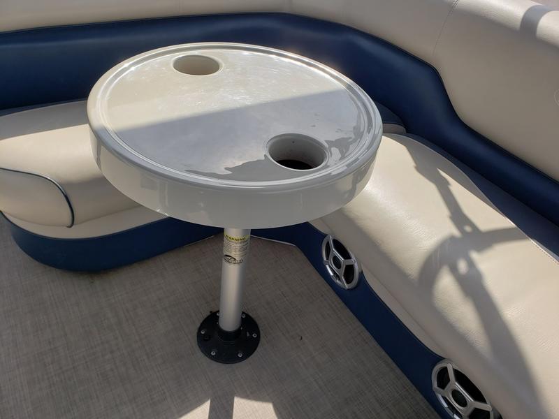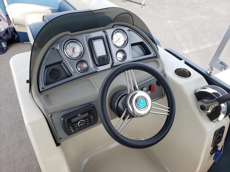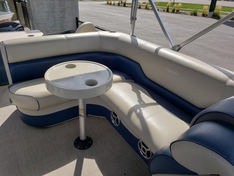 Awesome 2017 Premier 220 Horizon Fishing Edition Pontoon! It has a navy exterior, a tan, and navy interior, and a tan woven carpet. It comes equipped with a Mercury Pro 115 HP Outboard motor, swim ladder, navy bimini, lounge seating with round table, two swivel fishing chairs at rear, fish measuring unit at the rear, pole storage at the rear, pop up changing room, Garmin fish and depth finder, massive bow seating, sound system with Bluetooth capabilities, single axle Crestliner trailer, travel cover with rain poles, and much, much more.