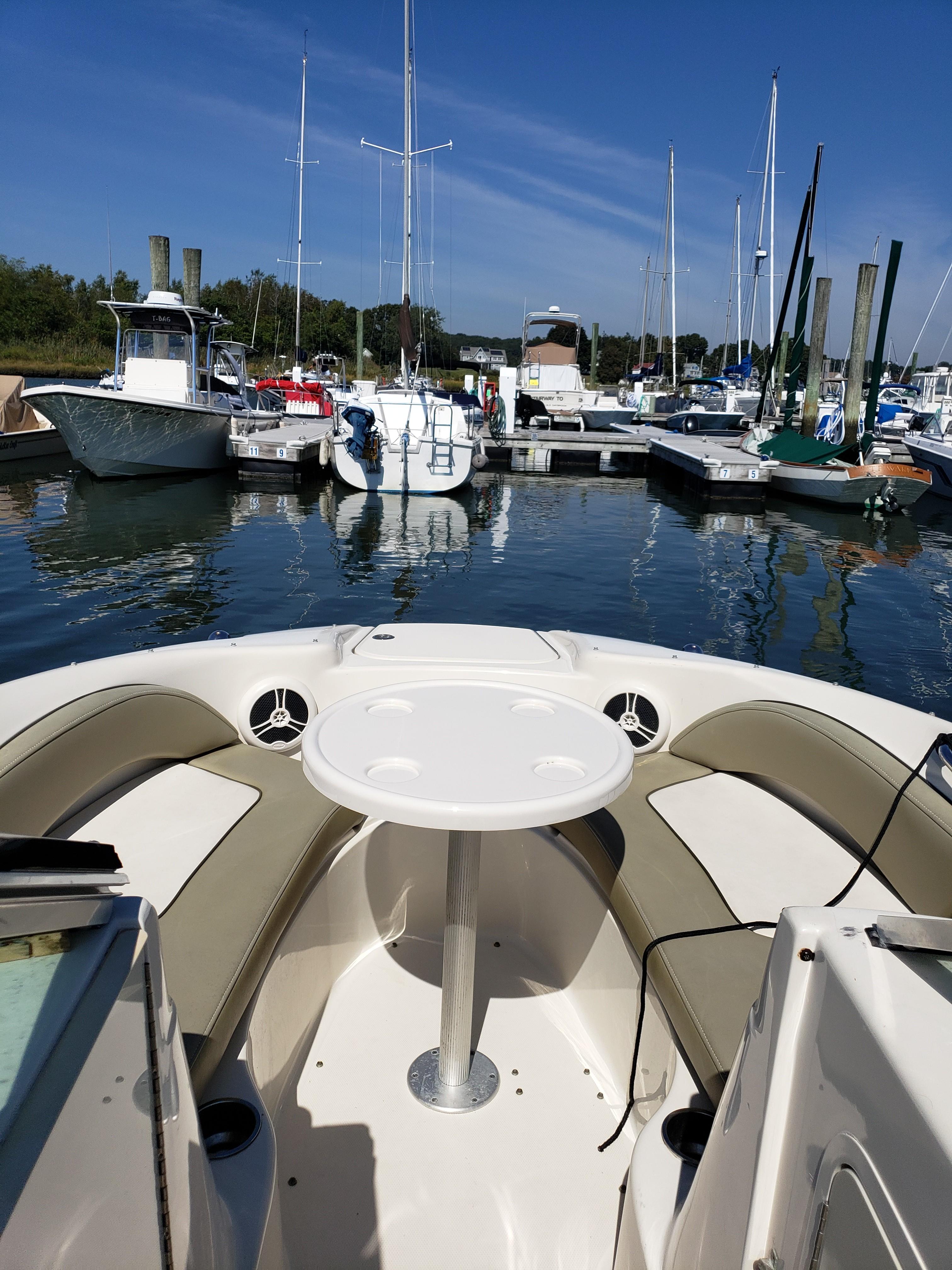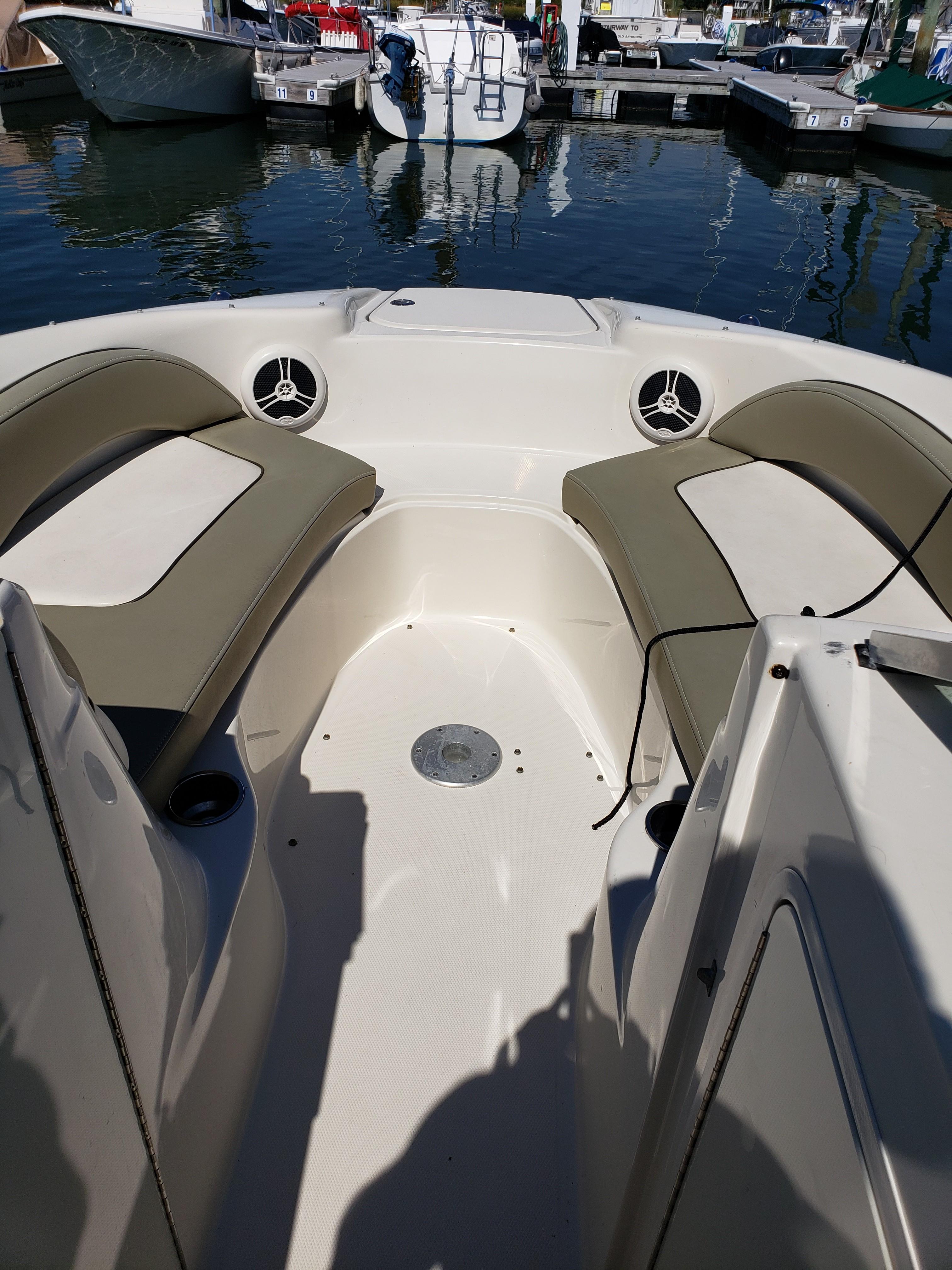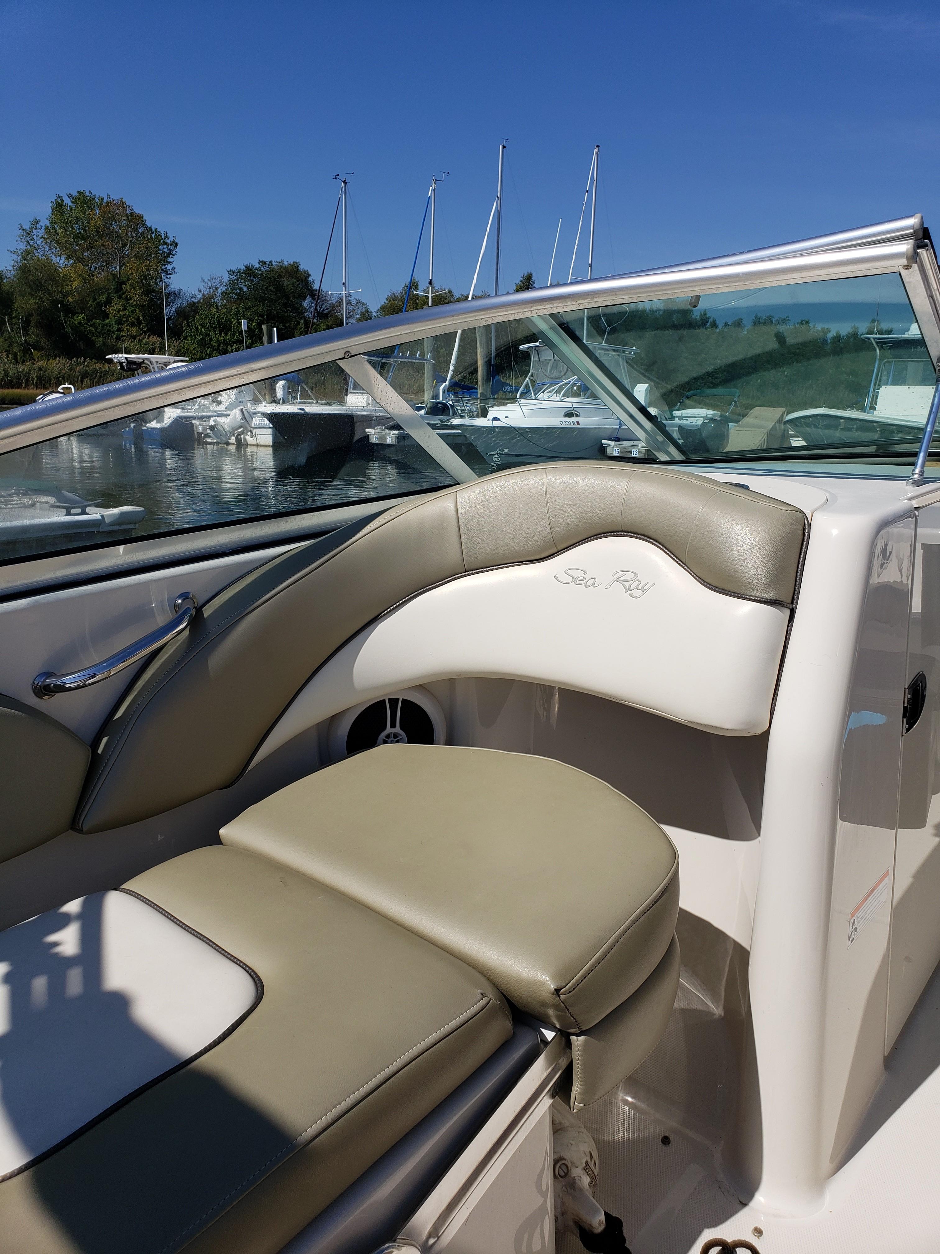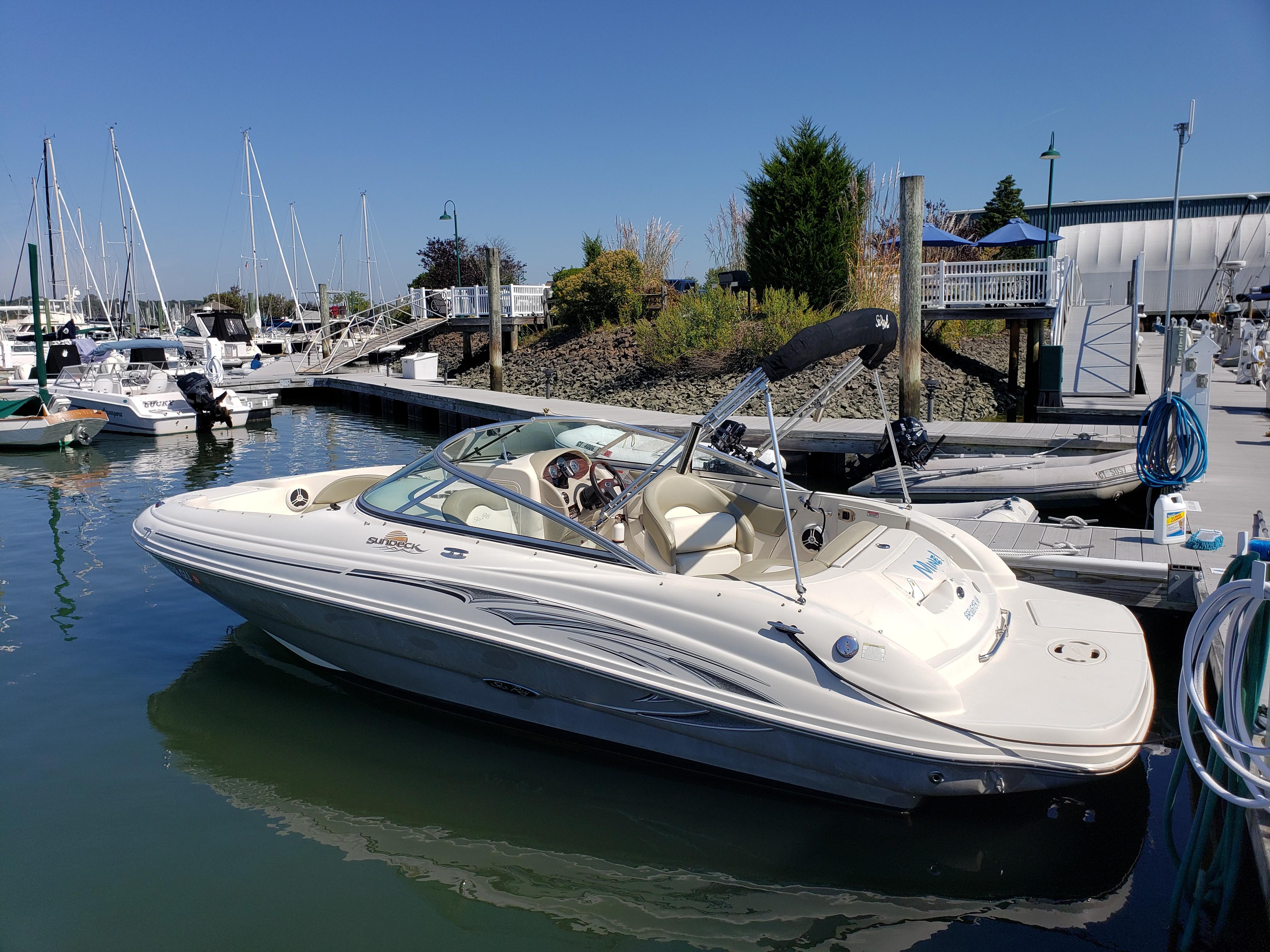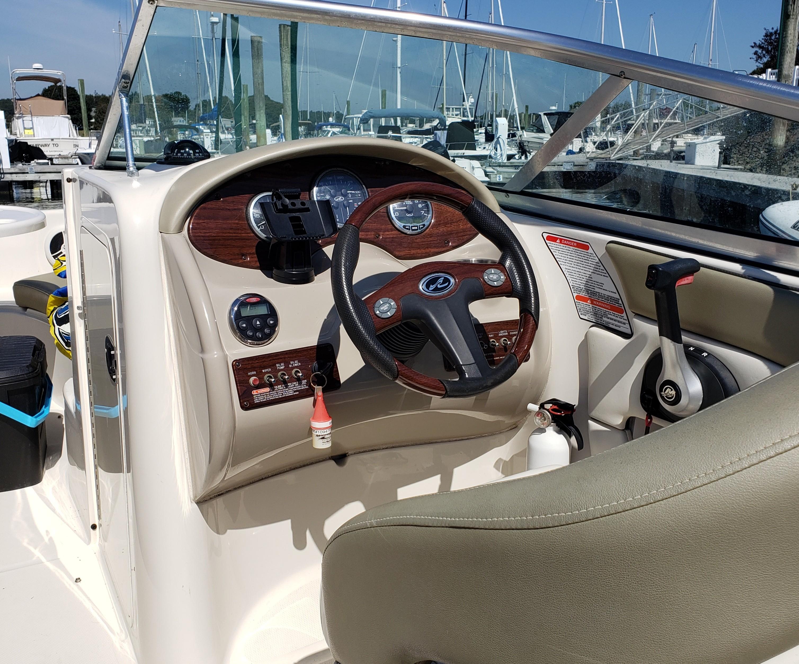 This very nice Sea Ray Sundeck 200 comes with water skis, water ski rope, aft cover, and bimini. It’s loaded with extras including a forward-facing seat that converts to a lounger, integral/extended swim platform, and a standard bimini top with stainless-steel hardware. Clarion stereo and speakers, Garmin GPS, 12-volt battery, fuse block. With a top-end that breaks 52-mph.