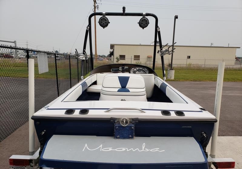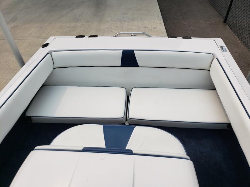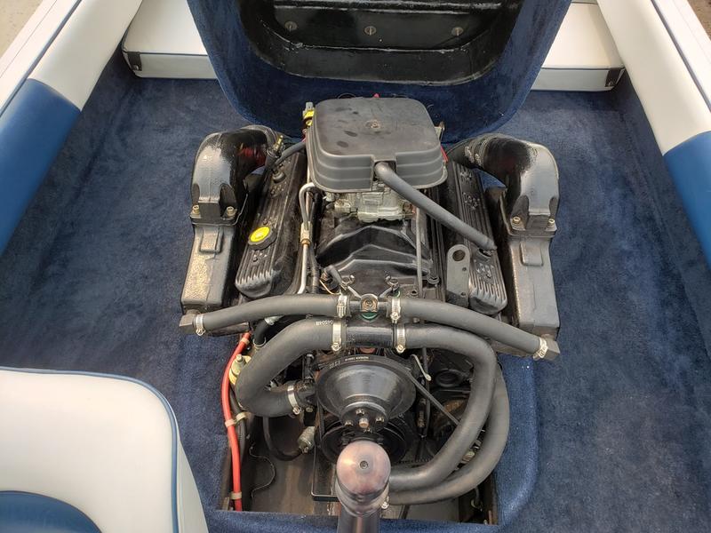 Very cool and unique little ski boat. Navy and white exterior, navy and white interior, and navy carpet flooring. 325 HP Indmar engine, tower with tower speakers, sound system, small swim platform, closed bow, beautiful condition, Gulfside single axle trailer.