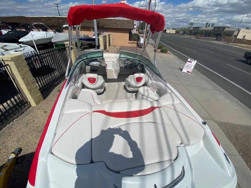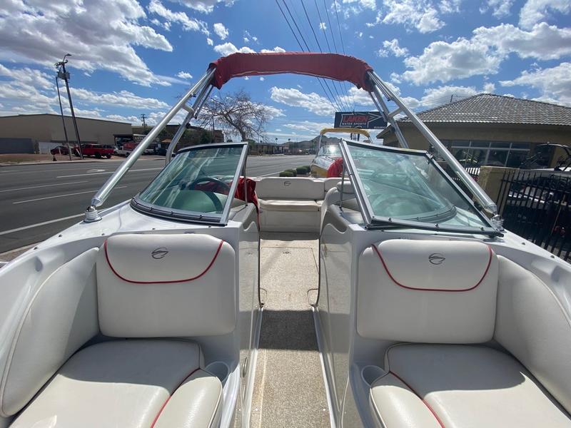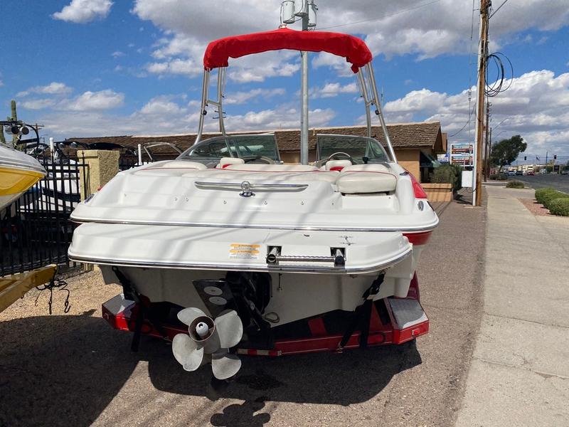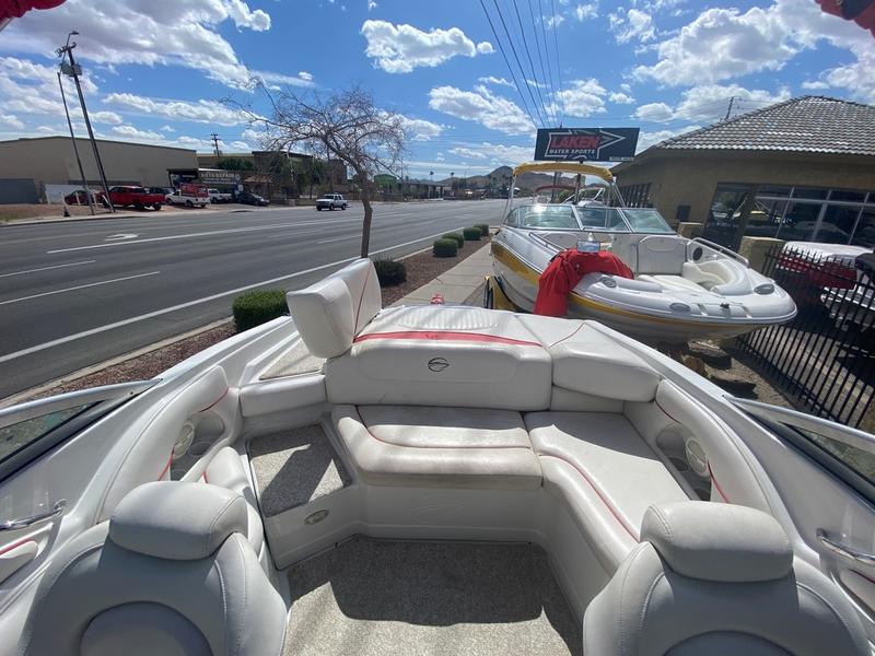 The interior layout is extremely accommodating with plenty of storage and seating up to 10 people. The transom walk-through has a filler cushion to preserve the comfortable full-length sunbed area. The cockpit seating features driver and passenger bucket seats with flip-up bolsters. The interior upholstery and carpet are in good condition. This boat is equipped with a table, tonneau covers, bimini top, cooler, stereo system, depth finder, etc. This boat has been well maintained and is looking for a new home!