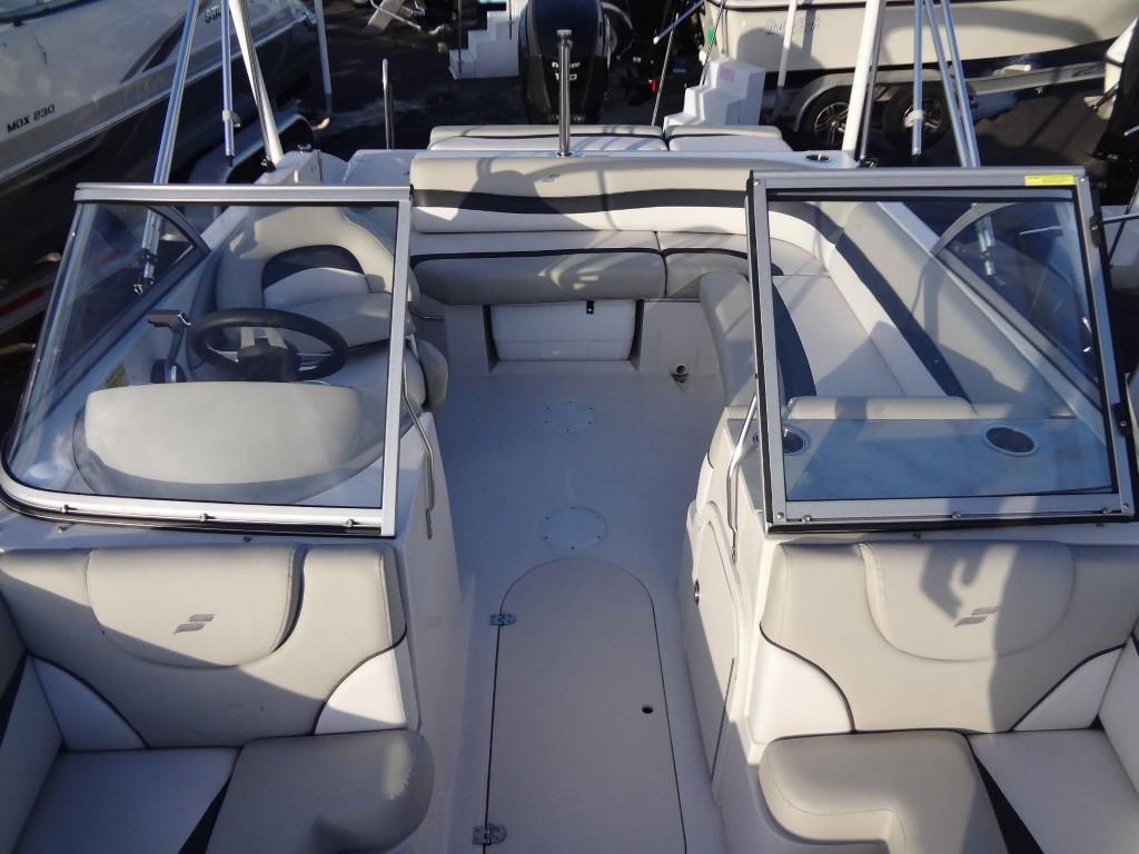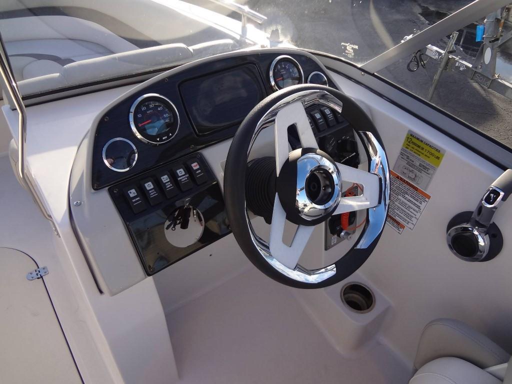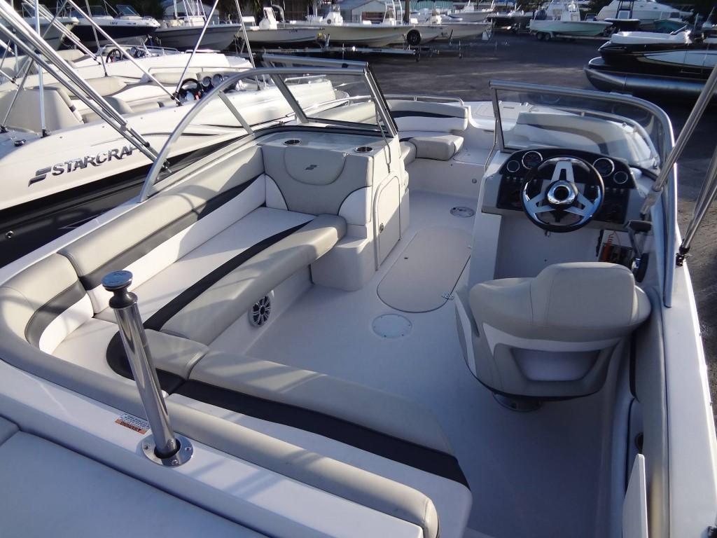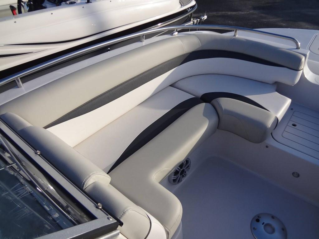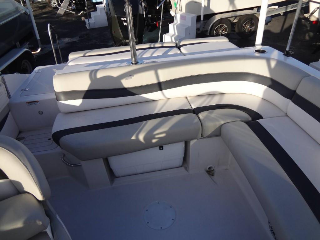 This 2019 Starcraft MDX 210 OB is powered by a 150 HP Evinrude V-TEC outboard. The helm features a walk-through windscreen, G2 hydraulic steering, interior lights, courtesy lights, an audio input/USB plug, a 12V plug, cup holders, and a captain’s chair. Other features include a black Bimini top, black bow and cockpit cover, a bow platform with a ladder, bow seating, underwater lights, exterior lights, cleats, ski tow, and black stainless steel rub rails.