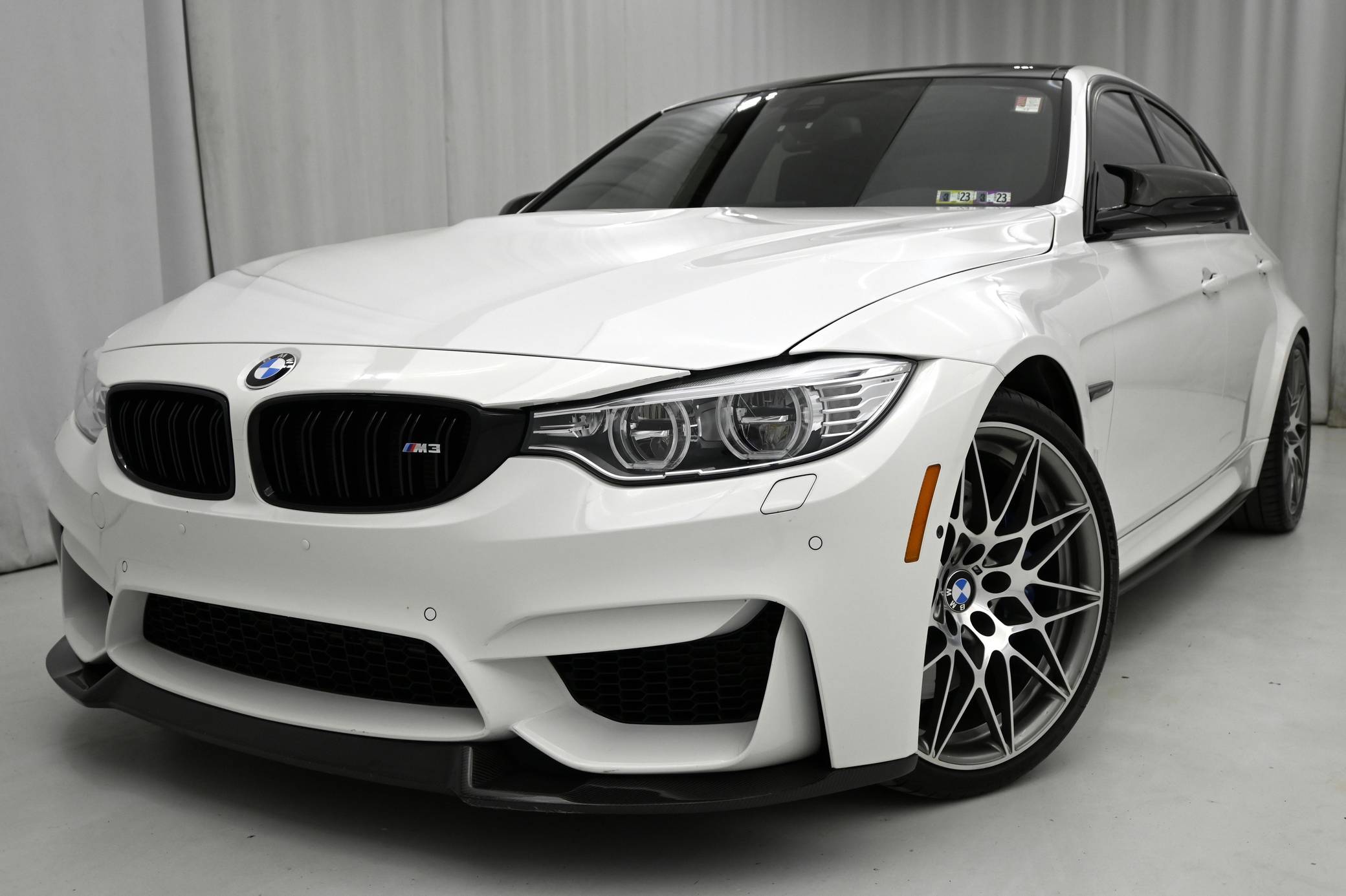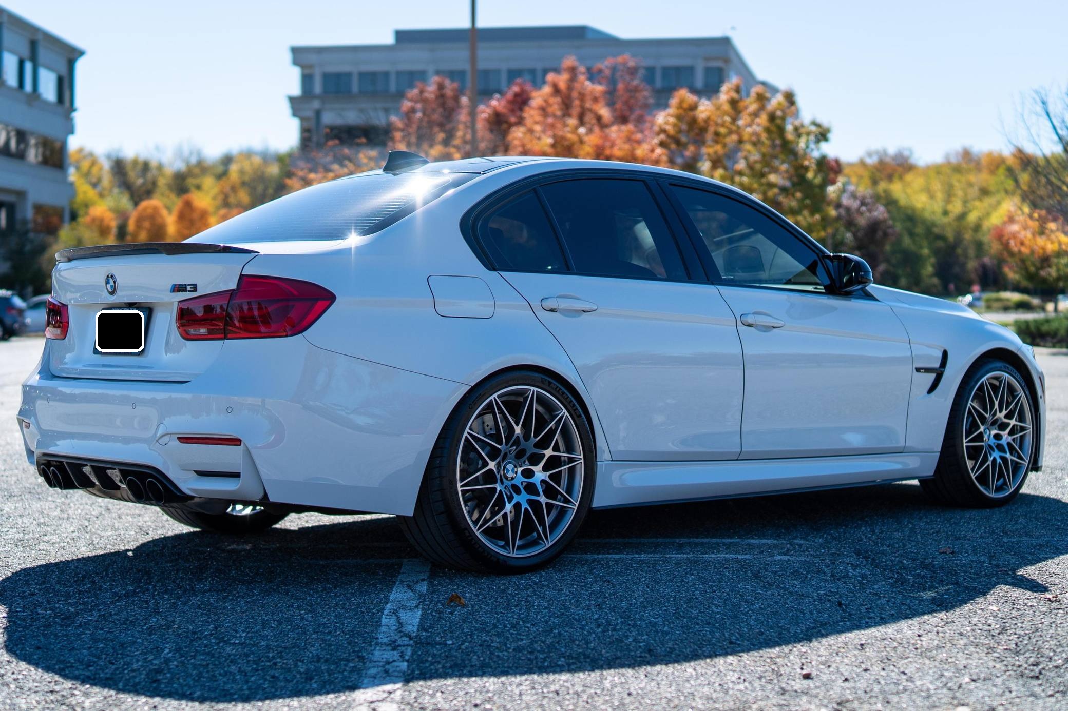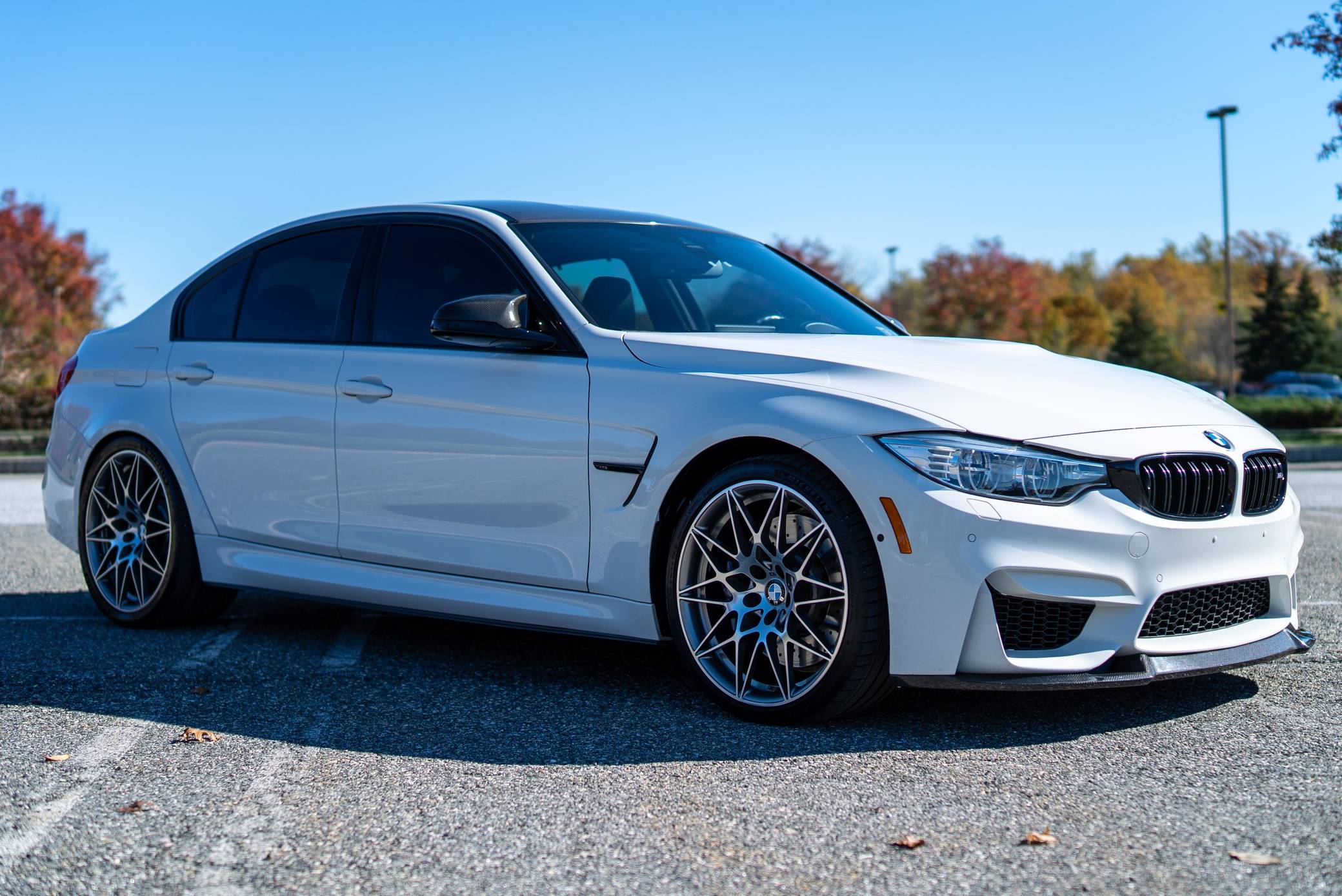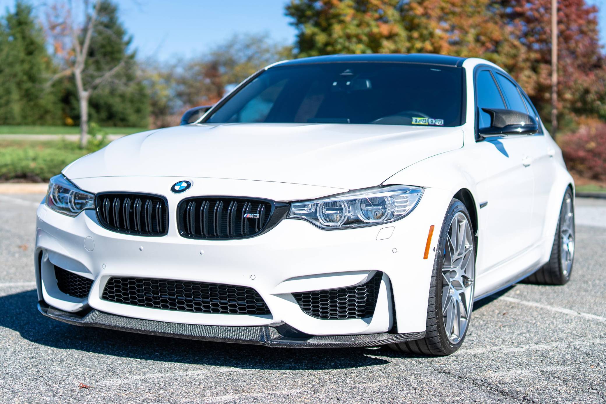 THIS… is a 2017 BMW M3, finished in Alpine White with a black interior. According to the build sheet provided in the gallery, factory equipment includes the Competition, Executive, Driver Assistance Plus, and Lighting packages, a carbon fiber roof panel, Merino leather upholstery, heated front and rear seats, a head-up display, Comfort Acess keyless entry, and a Harman/Kardon surround sound system. Modifications reported by the seller include paint protection film, tinted windows, a carbon fiber front splitter, side mirror caps, side skirt extensions, rear decklid spoiler, and rear diffuser. BMW's fifth-generation M3 went on sale for the 2015 model year. Based on the "F30" 3 Series, and called "F80" internally, it swapped its predecessor's V8 for a turbocharged straight-6 and picked up more horsepower and a lot more torque along the way. It wore a muscular-looking exterior design, and M added a carbon fiber roof panel to keep weight in check. Production ended in 2018. Power comes from an "S55" 3. 0-liter twin-turbocharged inline-6 engine, rated at 444 horsepower and 406 lb-ft of torque. Output is sent to the rear wheels via a 7-speed dual-clutch automatic transmission.