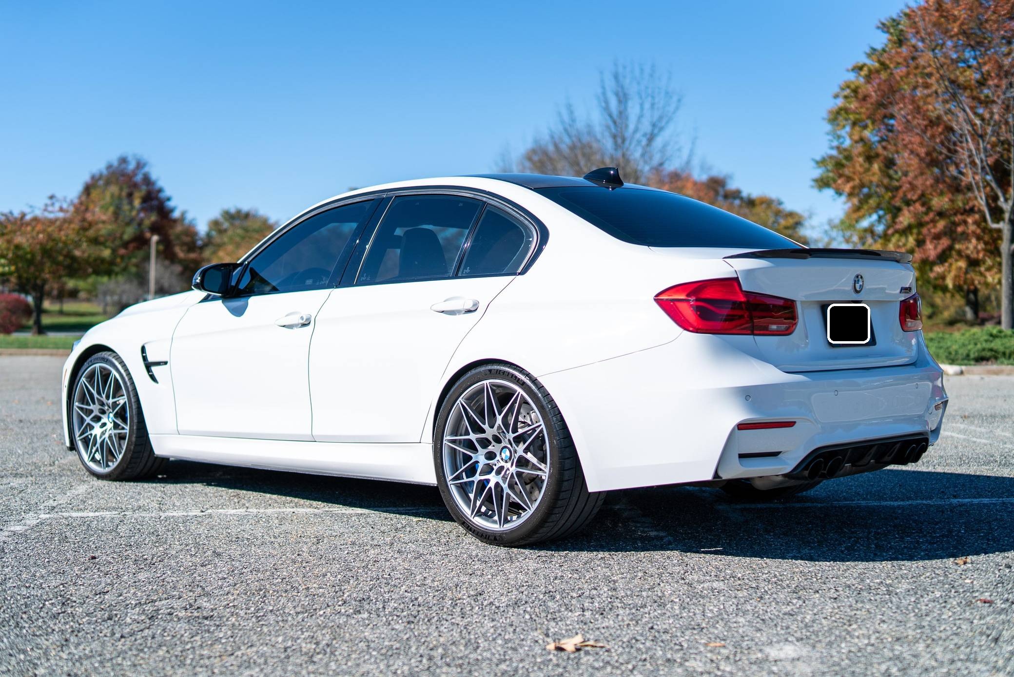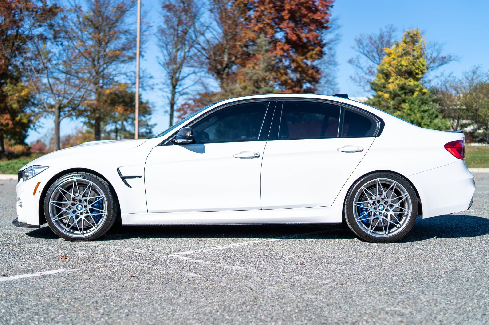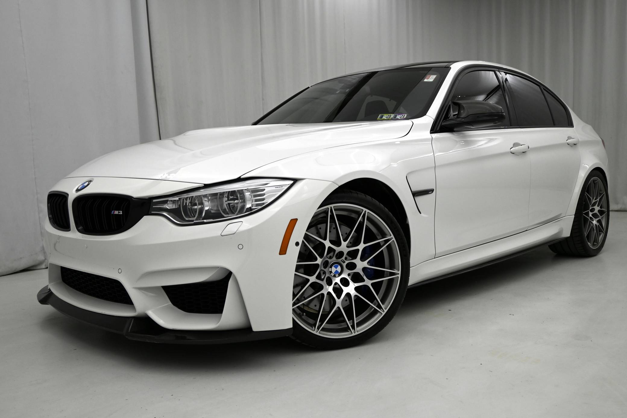 THIS… is a 2017 BMW M3, finished in Alpine White with a black interior. According to the build sheet provided in the gallery, factory equipment includes the Competition, Executive, Driver Assistance Plus, and Lighting packages, a carbon fiber roof panel, Merino leather upholstery, heated front and rear seats, a head-up display, Comfort Acess keyless entry, and a Harman/Kardon surround sound system. Modifications reported by the seller include paint protection film, tinted windows, a carbon fiber front splitter, side mirror caps, side skirt extensions, rear decklid spoiler, and rear diffuser. BMW's fifth-generation M3 went on sale for the 2015 model year. Based on the "F30" 3 Series, and called "F80" internally, it swapped its predecessor's V8 for a turbocharged straight-6 and picked up more horsepower and a lot more torque along the way. It wore a muscular-looking exterior design, and M added a carbon fiber roof panel to keep weight in check. Production ended in 2018. Power comes from an "S55" 3. 0-liter twin-turbocharged inline-6 engine, rated at 444 horsepower and 406 lb-ft of torque. Output is sent to the rear wheels via a 7-speed dual-clutch automatic transmission.