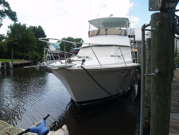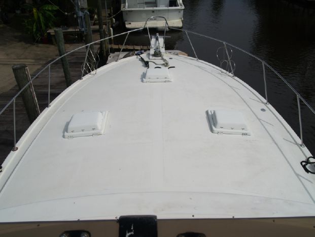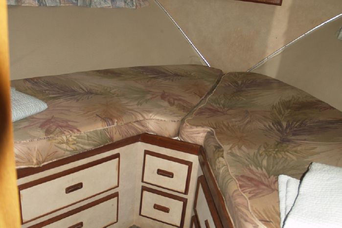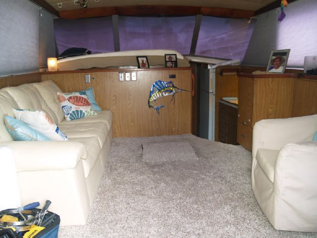 Interior: Features the standard two-stateroom, two head layout with the V-berth stateroom forward and guest head to starboard. The master stateroom is to port, with a queen-sized bed and a private full head with a separate stall shower forward. The mid-level full galley is to starboard with the spacious salon aft and up to two steps. The sofa is too port and the entertainment center is too starboard. The décor is Bertram's original Formica, wall coverings with teak trim and cabinetry throughout, beige carpet, beige leather sofa and barrel chair, duet blind, swing door to the cockpit.