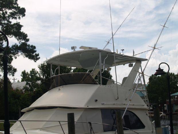 Deck & Fishing: Radar arch with hardtop, aft bridge rail riding seat, stainless steel rails, fiberglass cockpit deck, Rupp triple spreader outriggers with collapsible back bars and center rigger, built-in tackle storage over engine access, large Scopinich fighting chair with four gang rocket launcher backrest, cockpit coaming pads, four-rod holders on pilasters, Scopinich ladder back helm and companion chairs, bow pulpit with electric anchor windlass and Danforth anchor, transom door, four gunwale rod holders.