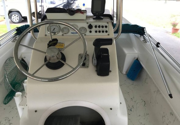 Center console fishing or pleasure boat, Minncota 55 thrust trolling motor with I pilot remote control, also foot pedal. Hummingbird fish finder & depth, 20-gallon inboard fuel tank, live well, rod holders, 48-quart cooler, console cover, and full boat cover. Roadking galvanized trailer with tire wheel. The boat is in almost new condition. Raised platform fishing chair and swim ladder.