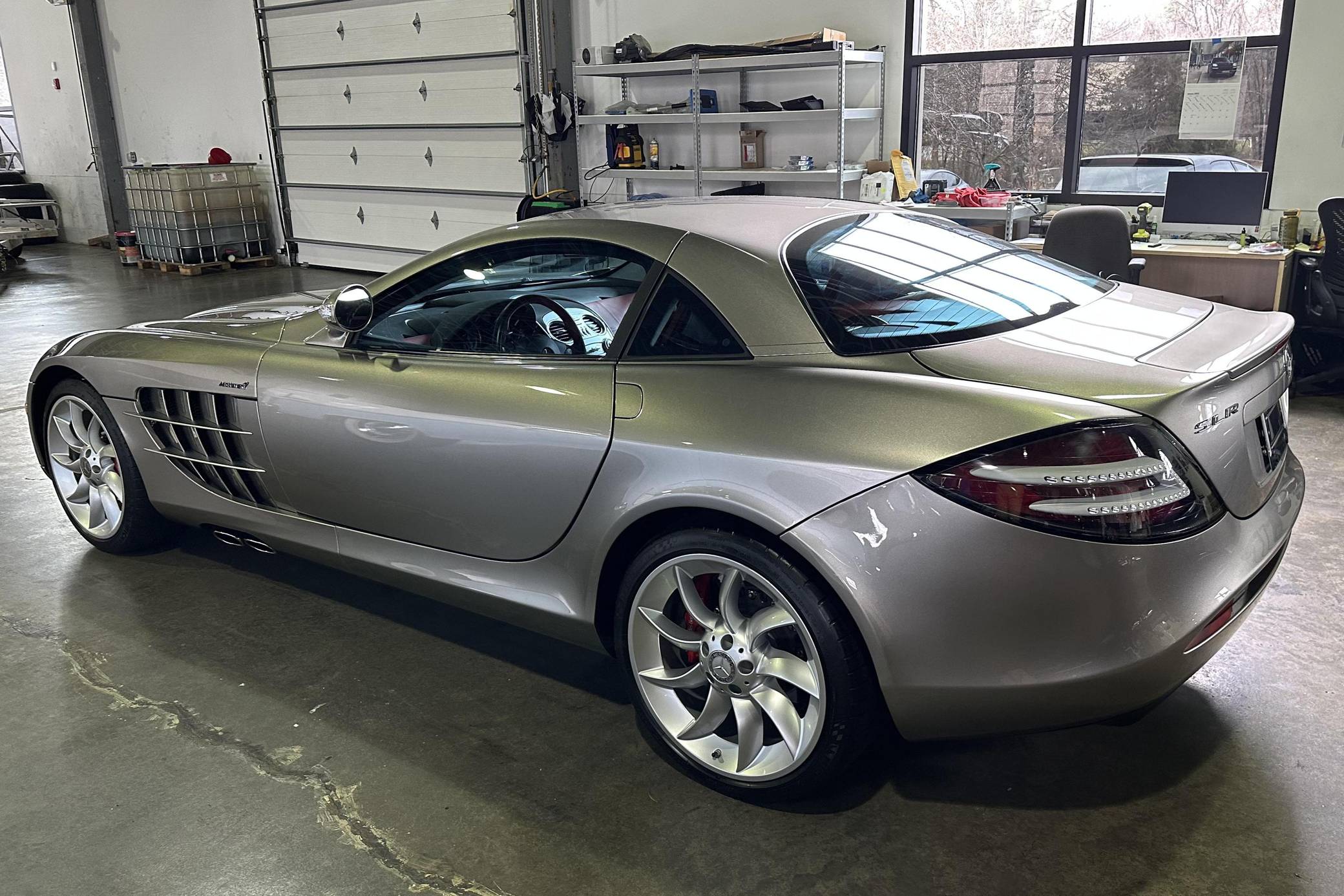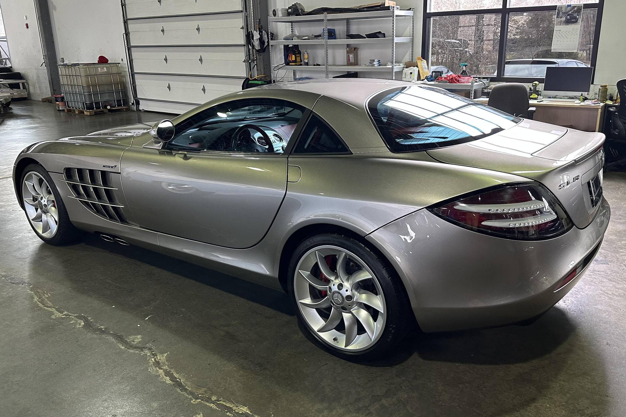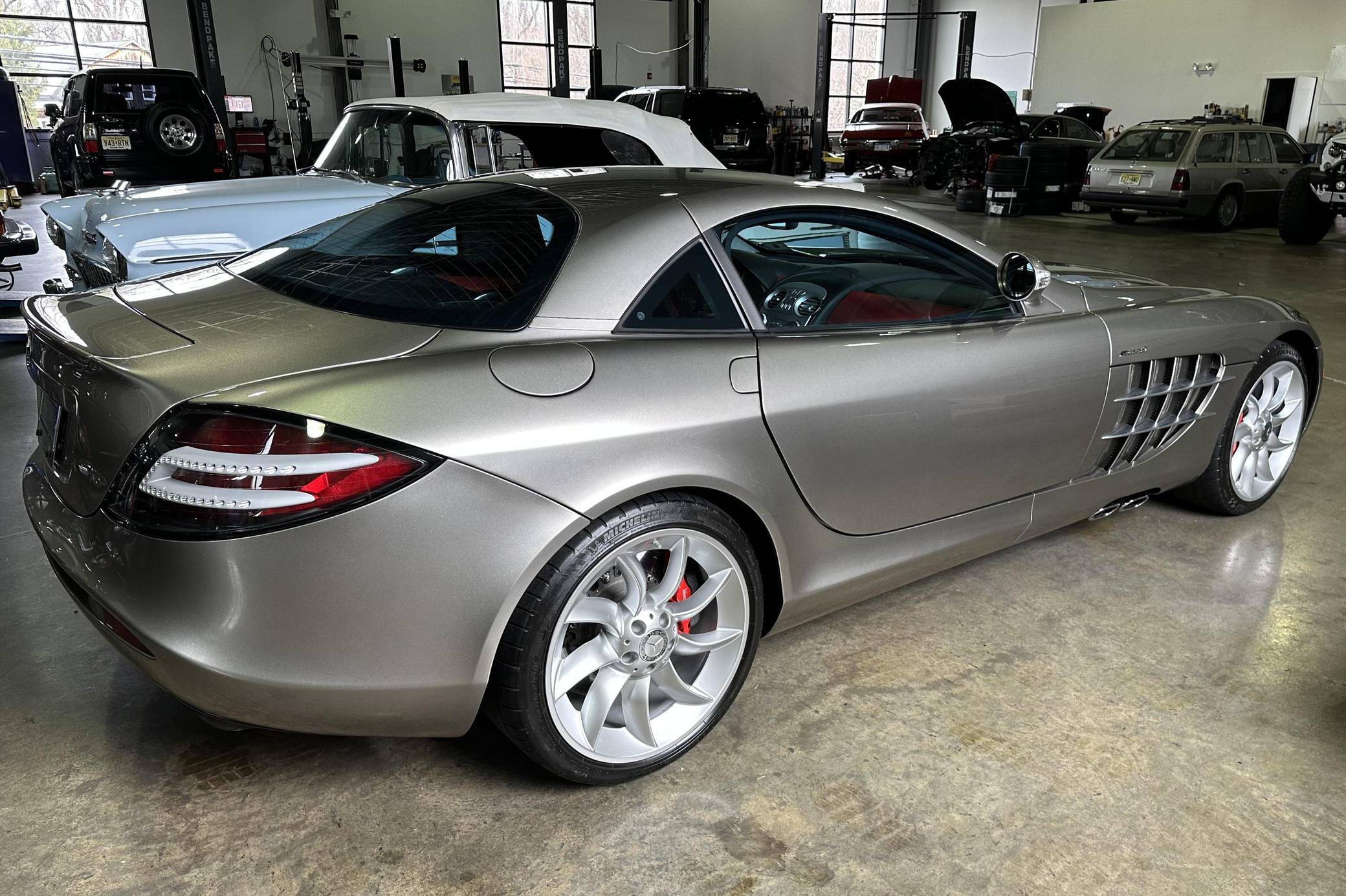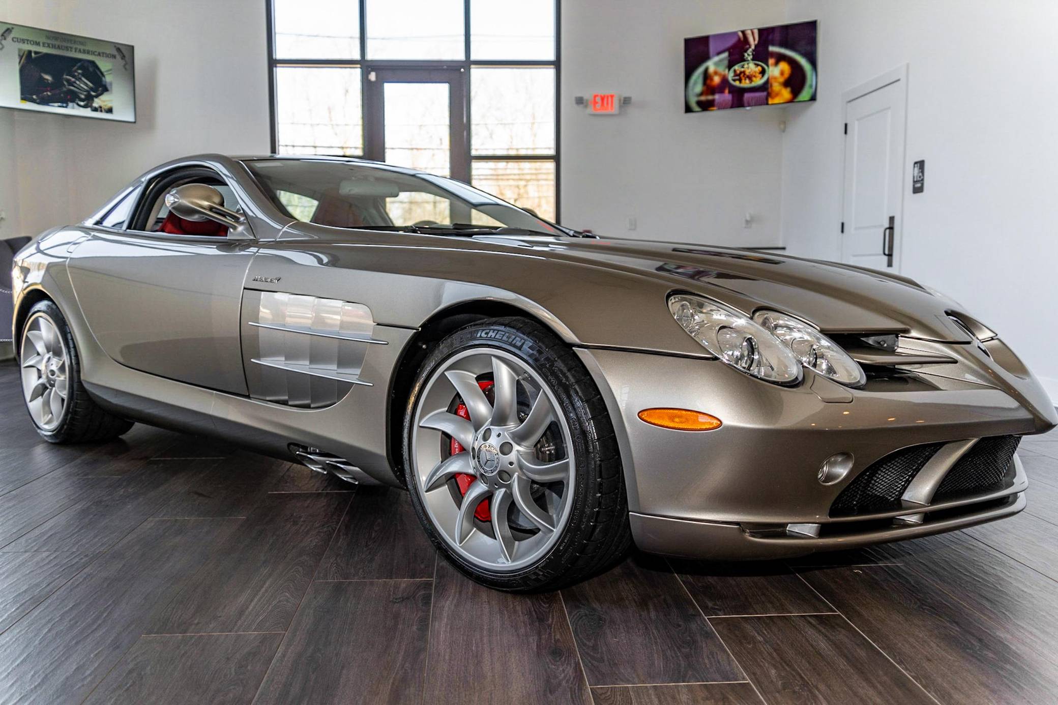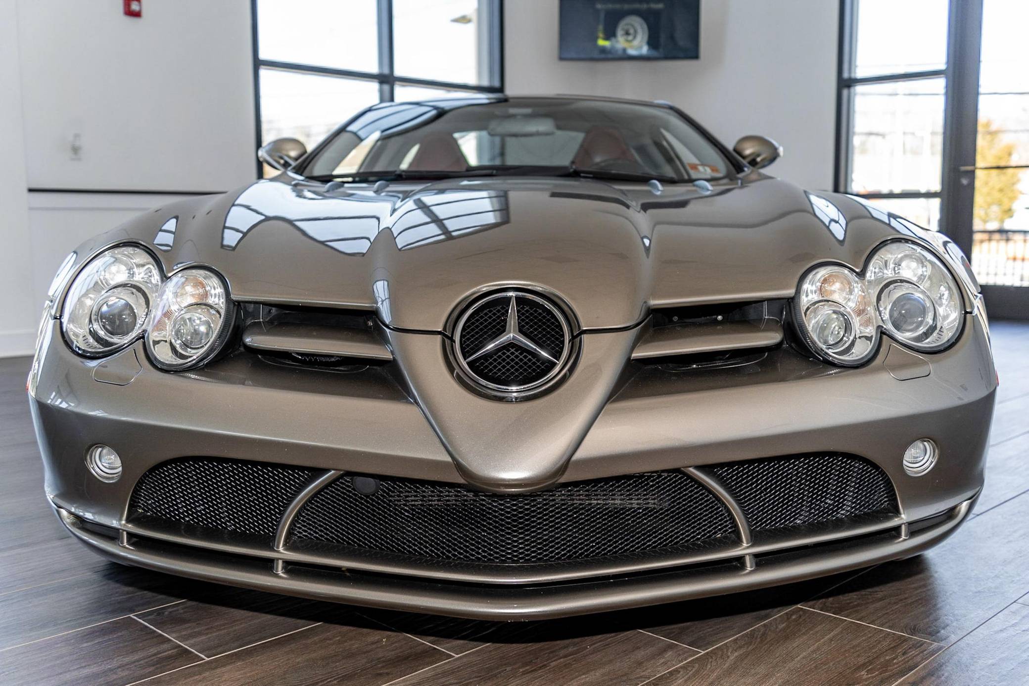THIS… is a 2006 Mercedes-Benz SLR McLaren Coupe, finished in Crystal Coronadite Grey over a 300SL Red interior. The odometer currently displays approximately 10,900 miles. It also shows that it has been primarily registered in Florida. Modifications reported by the seller are limited to paint protection film on the front end. Born out of a collaboration between Mercedes-Benz and McLaren, the SLR took inspiration from the legendary 300 SLR “Uhlenhaut Coupé” to become the Silver Arrow of the 21st century. Βased on a carbon fiber chassis and a front-mid-mounted supercharged V8 providing a tsunami of torque and a biblical soundtrack, the SLR left its mark as one of the most special Mercedes models in recent history. A total of 2,157 examples were reportedly produced in Coupe, and Roadster body styles, including 75 Stirling Moss speedsters. Power comes from a hand-built “M155” 5. 4-liter supercharged V8, rated at 617 horsepower and 575 lb-ft of torque. Output is sent to the rear wheels via a 5-speed “AMG Speedshift R” automatic transmission.