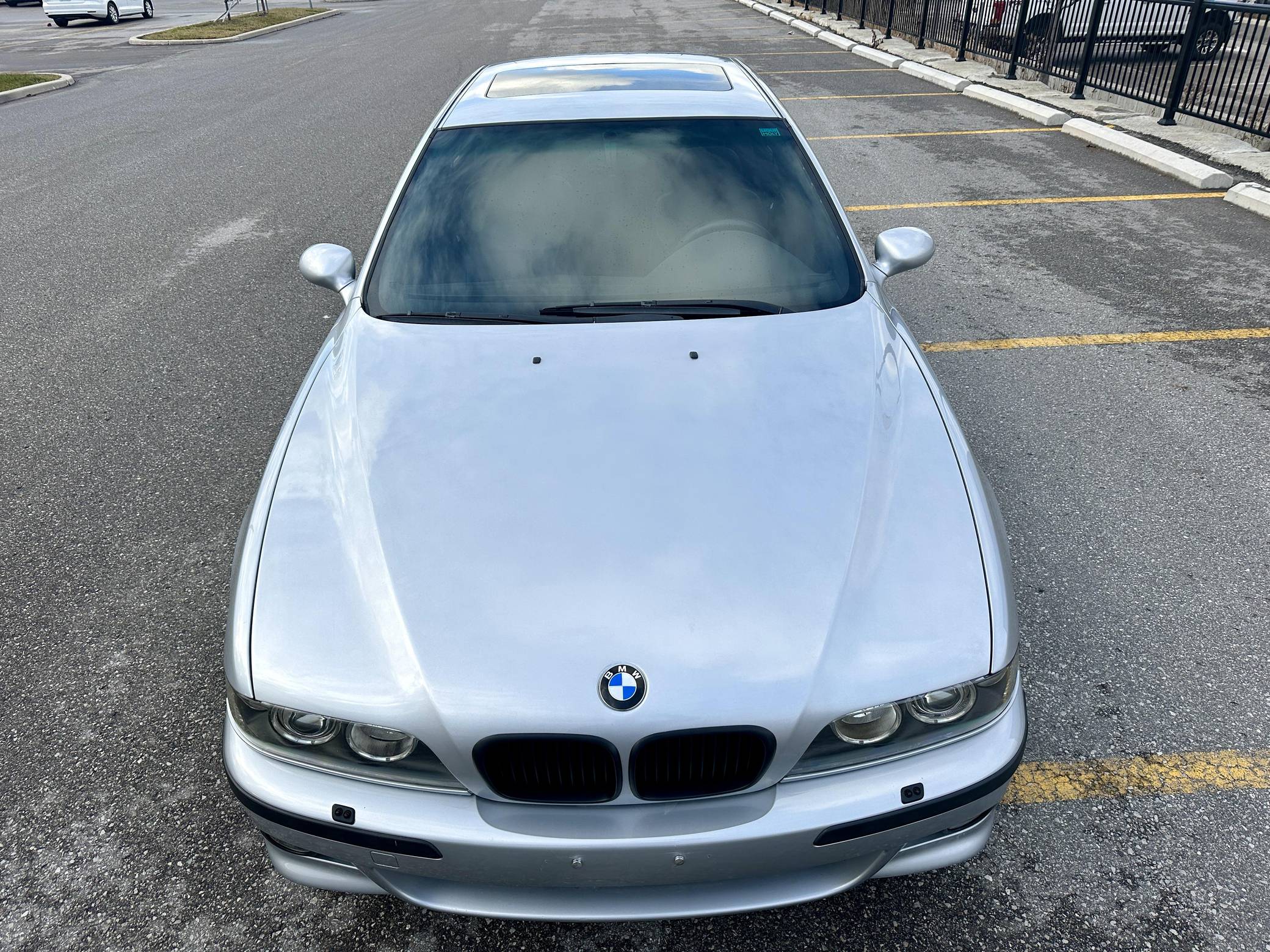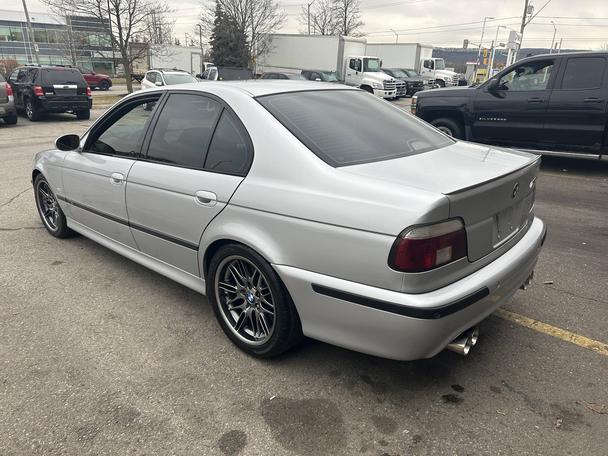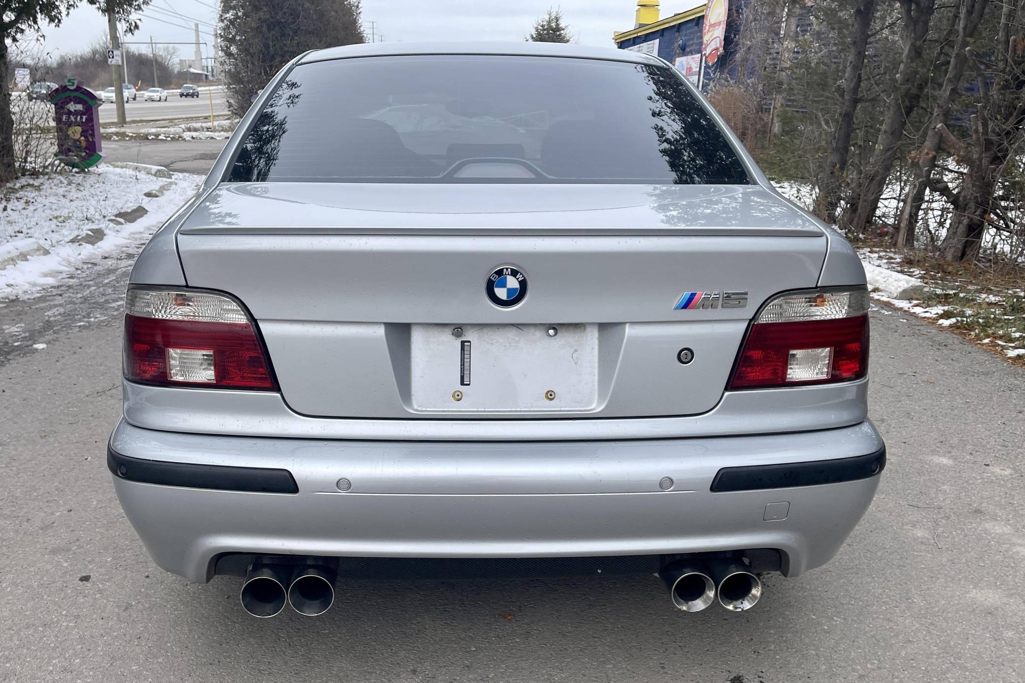 THIS… is a 2000 BMW M5, finished in Titanium Silver Metallic with a black and Le Mans Blue interior. It's equipped with a metric instrument cluster, and its odometer shows about 211,600 kilometers, which represents around 131,500 miles. The attached U. S. According to the build sheet provided in the gallery, factory equipment includes 18-inch Style 65 wheels, Park Distance Control, headlight washers, a power sunroof, heated and power-adjustable front seats with driver-side memory, and a 6-disc CD changer. Modifications reported by the seller include MagnaFlow exhaust components, black kidney grilles, aftermarket headlights, tinted windows, and an aftermarket steering wheel, shift knob, and shift boot. Heralded by brand enthusiasts as the best of its breed, the "E39"-generation M5 arrived in America for the 2000 model year. It was the first of several M-developed cars powered by a V8 engine, and it was exclusively available with a 6-speed manual transmission. Car & Driver crowned it "the most desirable sedan in the world" in 2000. Power comes from an "S62" 4. 9-liter V8, rated at 394 horsepower and 369 lb-ft of torque. Output is sent to the rear wheels via a 6-speed manual transmission.