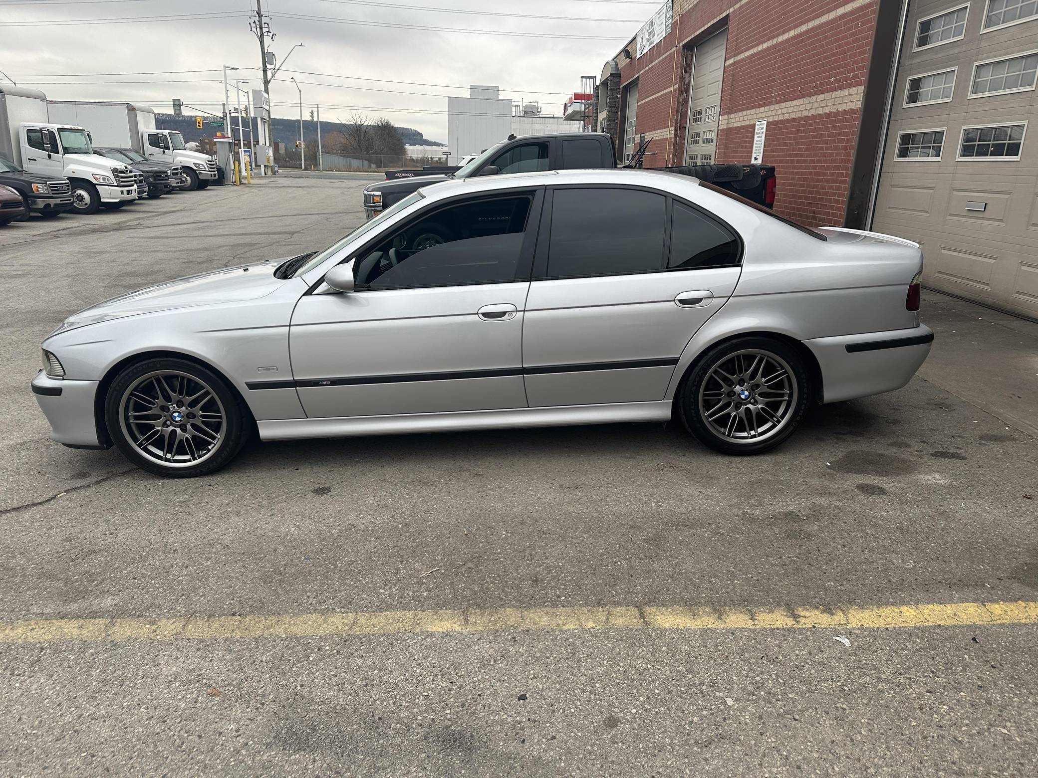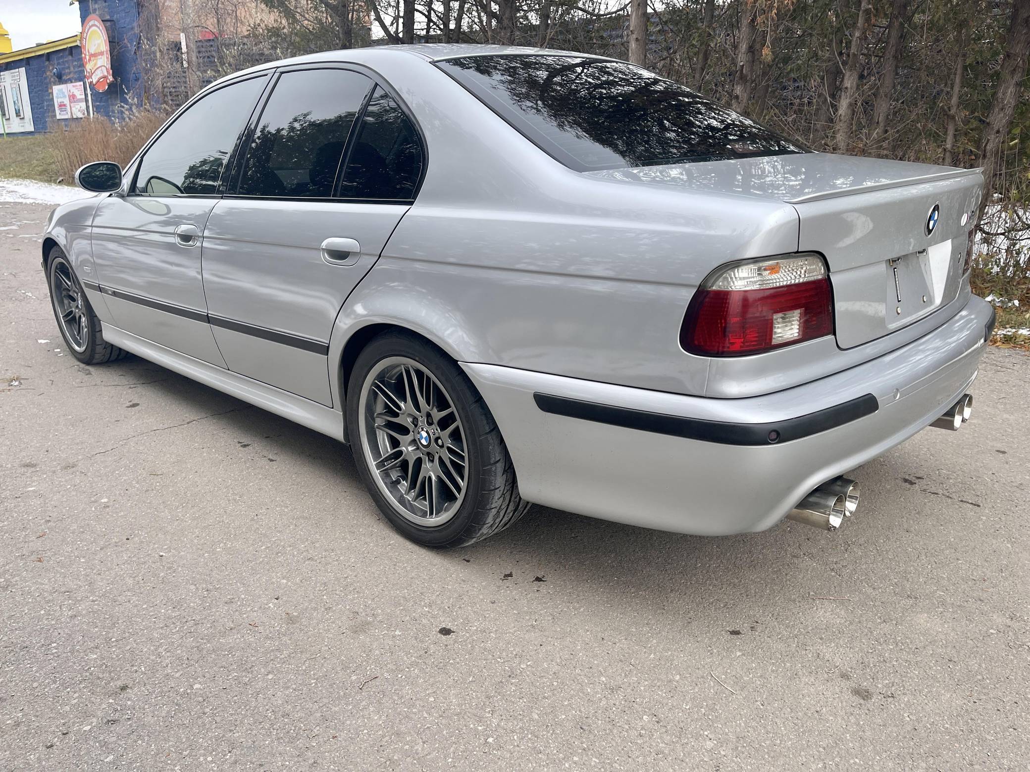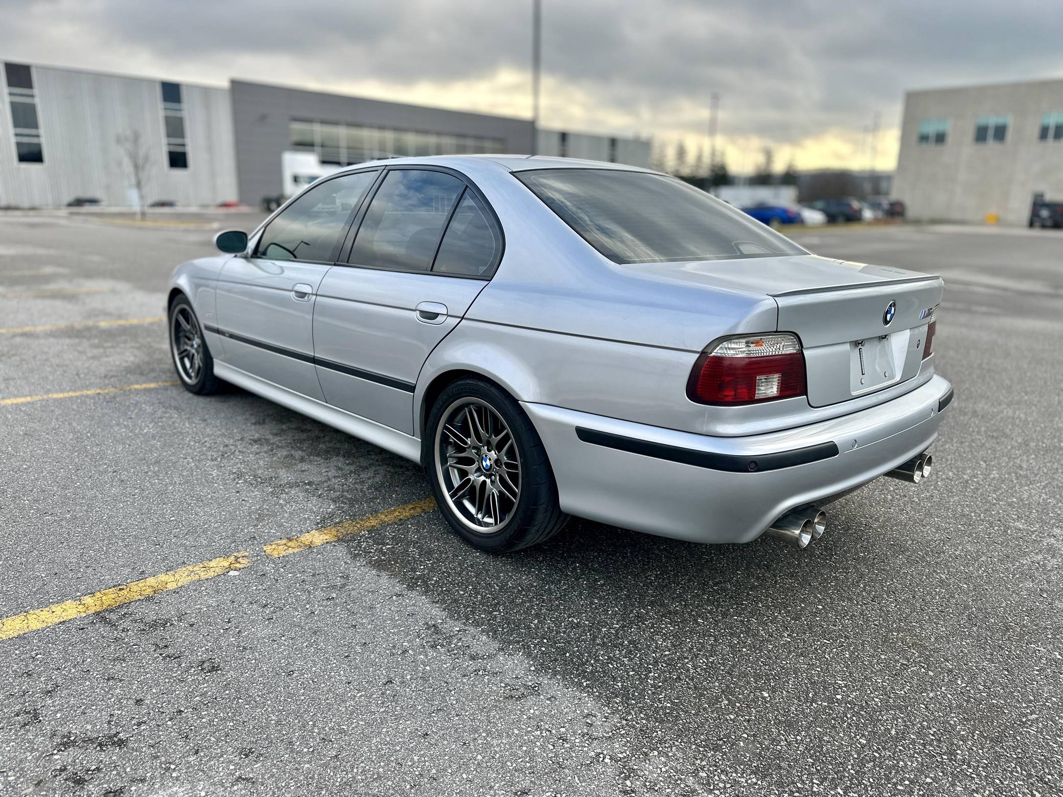 THIS… is a 2000 BMW M5, finished in Titanium Silver Metallic with a black and Le Mans Blue interior. It's equipped with a metric instrument cluster, and its odometer shows about 211,600 kilometers, which represents around 131,500 miles. The attached U. S. According to the build sheet provided in the gallery, factory equipment includes 18-inch Style 65 wheels, Park Distance Control, headlight washers, a power sunroof, heated and power-adjustable front seats with driver-side memory, and a 6-disc CD changer. Modifications reported by the seller include MagnaFlow exhaust components, black kidney grilles, aftermarket headlights, tinted windows, and an aftermarket steering wheel, shift knob, and shift boot. Heralded by brand enthusiasts as the best of its breed, the "E39"-generation M5 arrived in America for the 2000 model year. It was the first of several M-developed cars powered by a V8 engine, and it was exclusively available with a 6-speed manual transmission. Car & Driver crowned it "the most desirable sedan in the world" in 2000. Power comes from an "S62" 4. 9-liter V8, rated at 394 horsepower and 369 lb-ft of torque. Output is sent to the rear wheels via a 6-speed manual transmission.