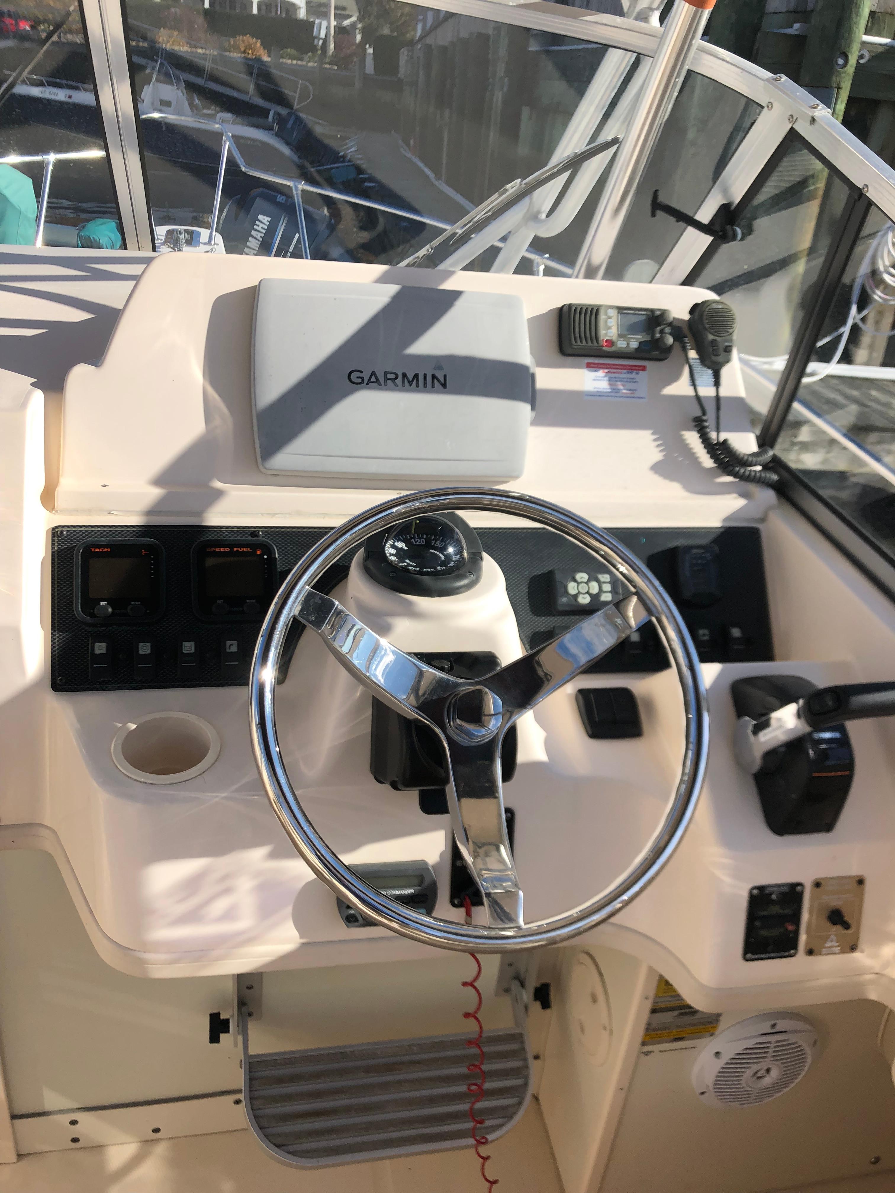 Hardtop with rod holders, Bow pulpit w/Lewmar anchor windlass, Garmin GPS/Plotter/Fishfinder/Radar, Garmin 18 HD Radar array, Kenwood radio, Hardtop mounted outrigger with bottom controls, Bennett trim tabs, Jabsco electric head with holding tank and macerator discharge, Forward deck cushions, Live well, Cockpit shower, Cockpit spreader lights, Windshield washer, Washdown system. Aluminum 3 axle stuffy trailer all mag wheels 6 disc breaks and all-electric powered breaks. 2 new batteries.