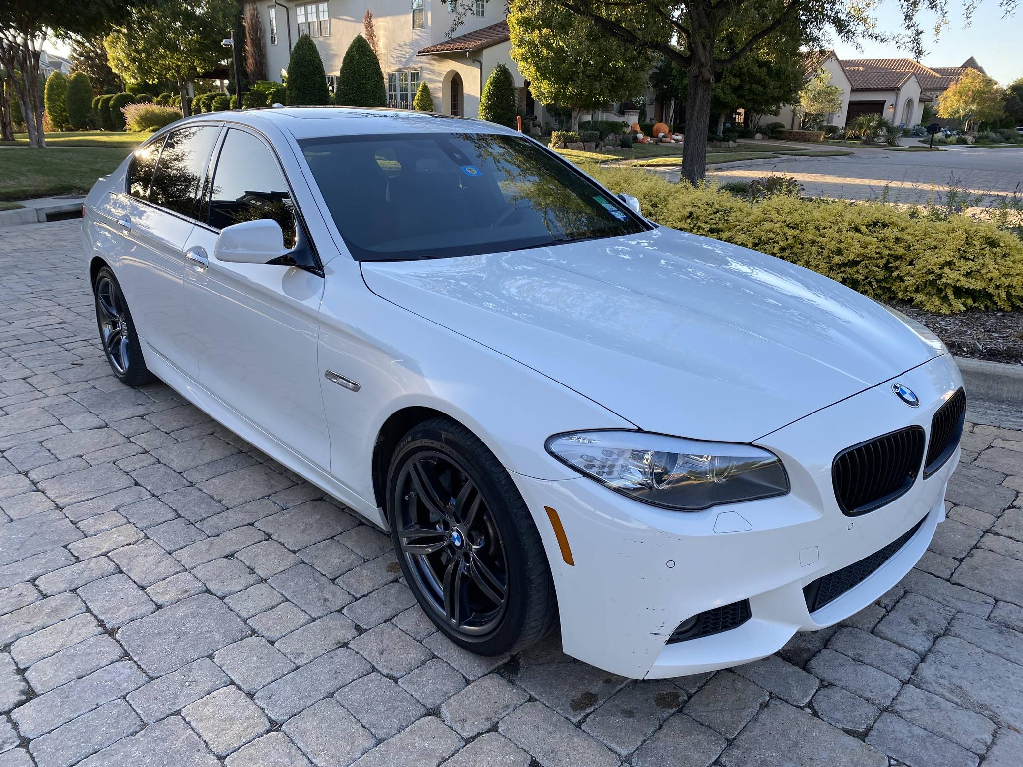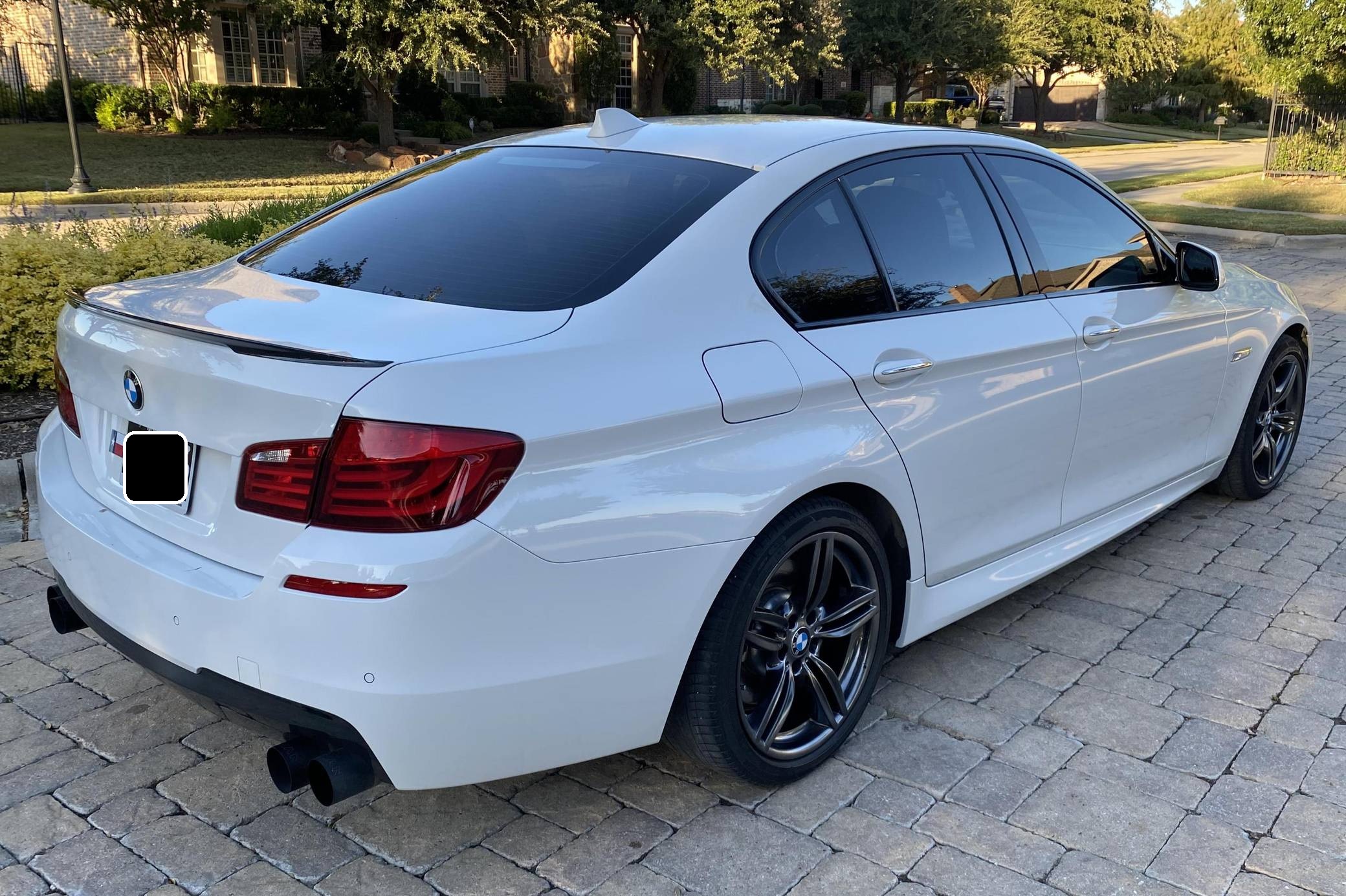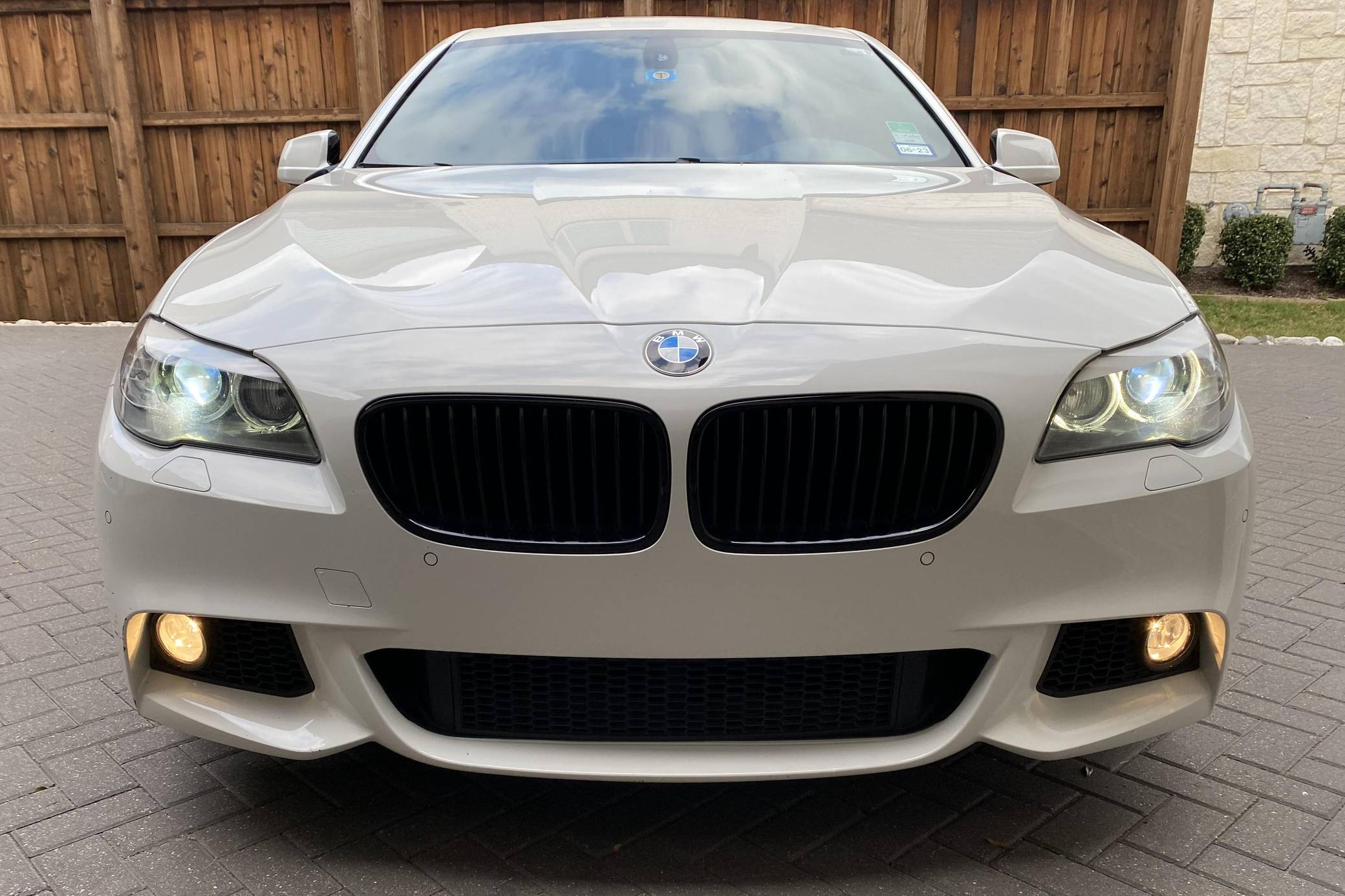 THIS… is a 2012 BMW 550i, finished in Alpine White with a black interior. Factory equipment includes M Sport, Premium Sound, and Convenience packages, adaptive xenon headlights, a sunroof, Dakota leather upholstery, heated front seats, Anthracite wood trim, ceramic controls, rear sunshades, and a navigation system, among others listed below. Modifications reported by the seller include 19-inch factory wheels finished in black chrome, Dinan Stage 3 engine software, a Dinan free flow exhaust, black kidney grilles, ceramic window tint, a rear badge delete, and a carbon fiber rear spoiler. BMW released the F10-generation 5 Series for the 2011 model year. It wore a less extroverted design than its predecessor, and engineers overhauled nearly every part of the chassis to ensure it remained the driver's choice in the segment in the face of growing competition. Available at launch, the 550i landed at the top of the non-M-tuned range. Power for this 550i comes from a twin-turbocharged 4. 4-liter V8 engine, rated at 400 horsepower and 450 lb-ft of torque when left stock. According to the dealership Classic BMW, this 550i is now rated at 511 horsepower and 580 lb-ft of torque. Output is sent to the rear wheels via an 8-speed automatic transmission.