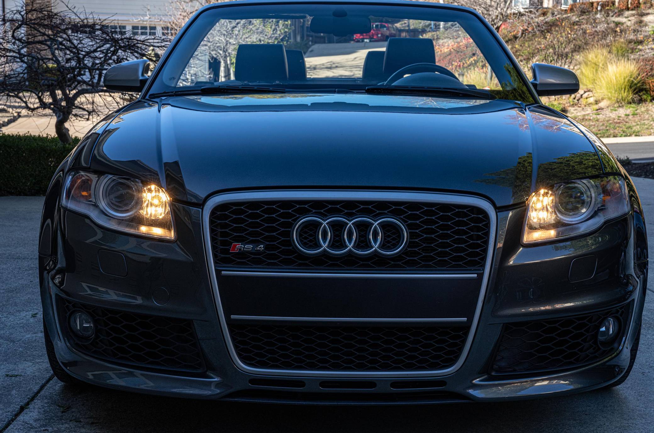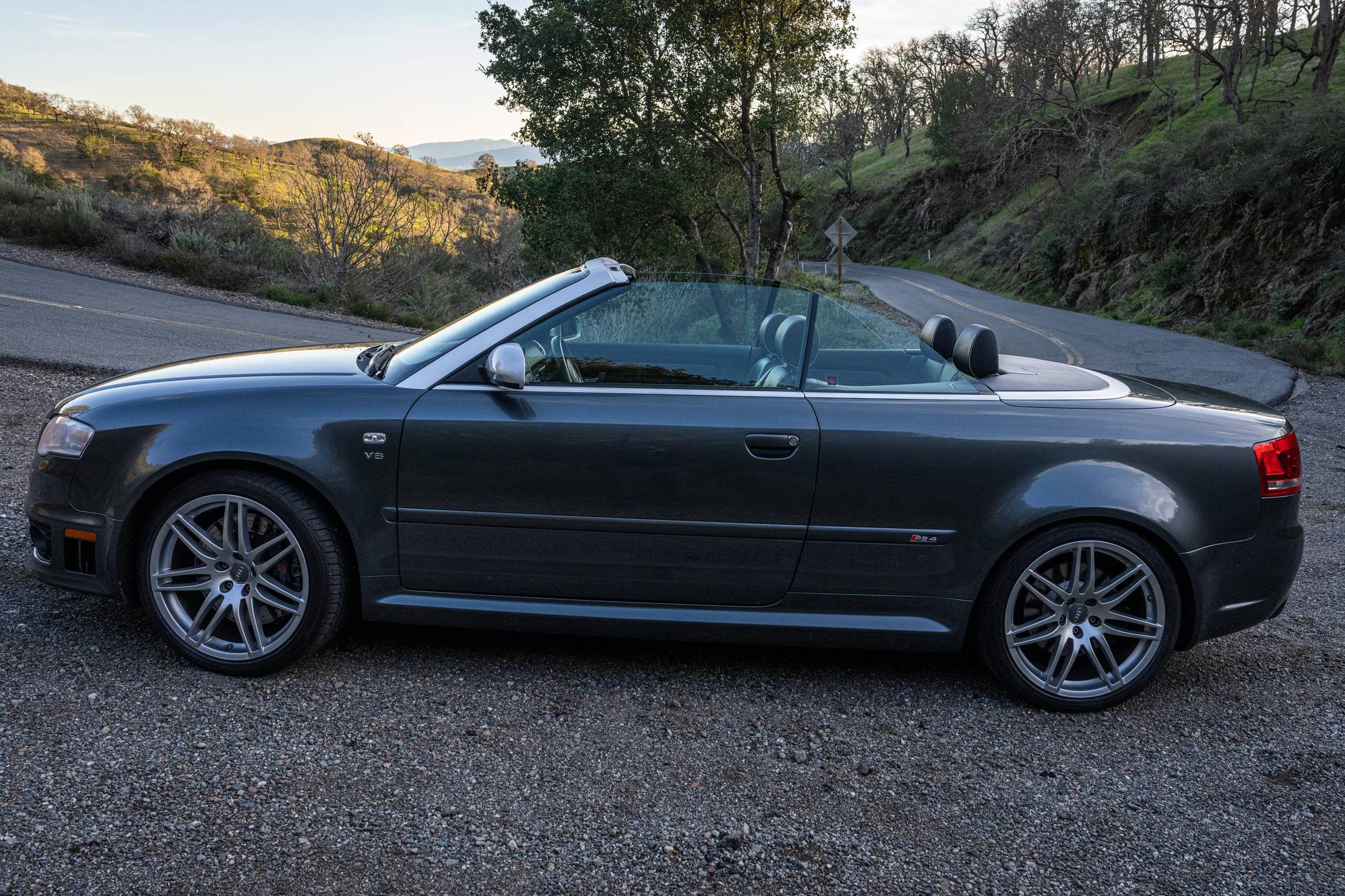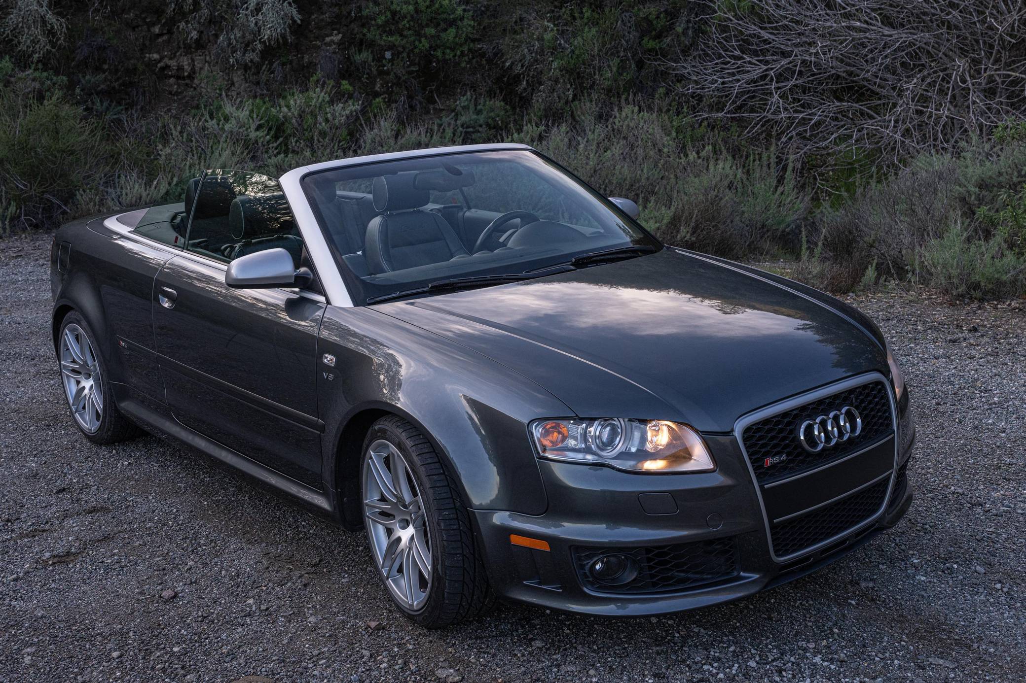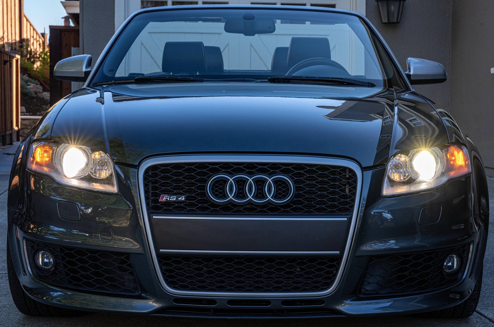 THIS… is a 2008 Audi RS4 Cabriolet, finished in Daytona Gray with a black interior. This RS4 is equipped with a 6-speed manual transmission, and its odometer currently displays about 45,600 miles. It also confirms that this is a one-owner car that's been registered in California from new. Factory equipment includes 19-inch alloy wheels, RS4-specific sport suspension, bi-xenon headlights, a power-retractable soft top, Silk Nappa leather upholstery, carbon fiber interior trim, heated front seats, a Bose premium sound system, and a navigation system. The seller reports no modifications. Audi sold the "B7" generation RS4 in the United States during the 2007 and 2008 model years. Offered as a sedan and as a convertible, both body styles were exclusively equipped with a 6-speed manual transmission. Audi hasn't made another RS4 available in America since, largely because the next two generations were only made as station wagons. Power comes from a 4. 2-liter V8, rated at 420 horsepower and 317 lb-ft of torque. Output is sent to all four wheels via a 6-speed manual transmission and Audi's Quattro permanent all-wheel drive system.