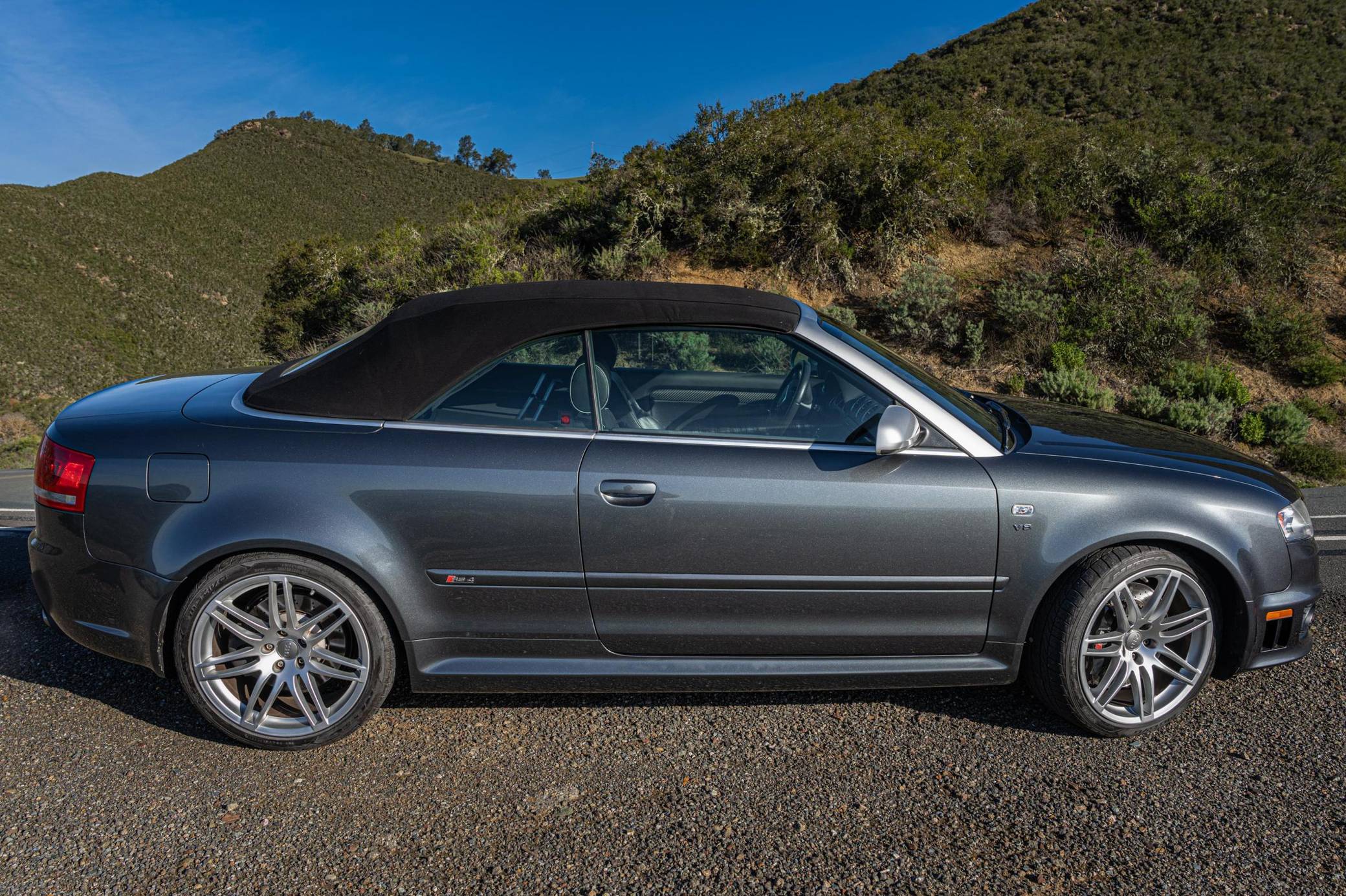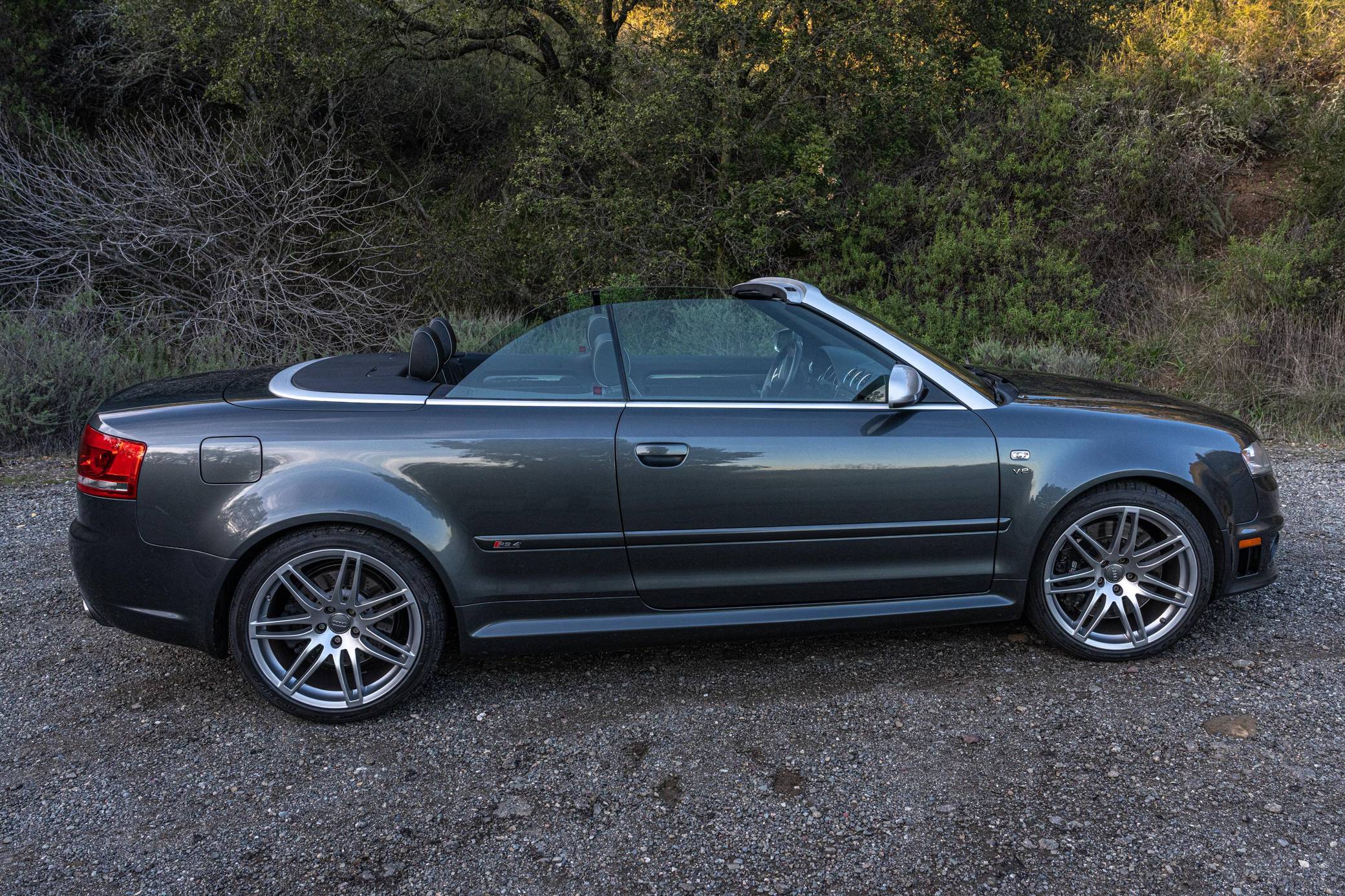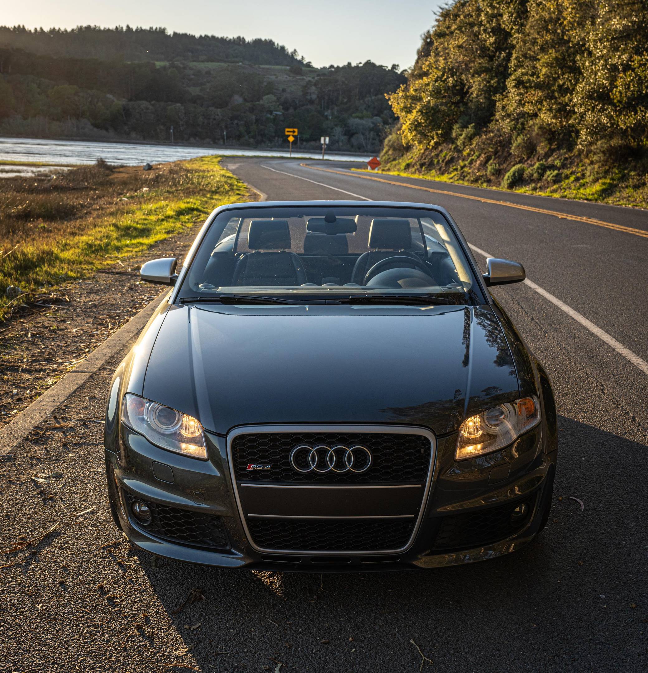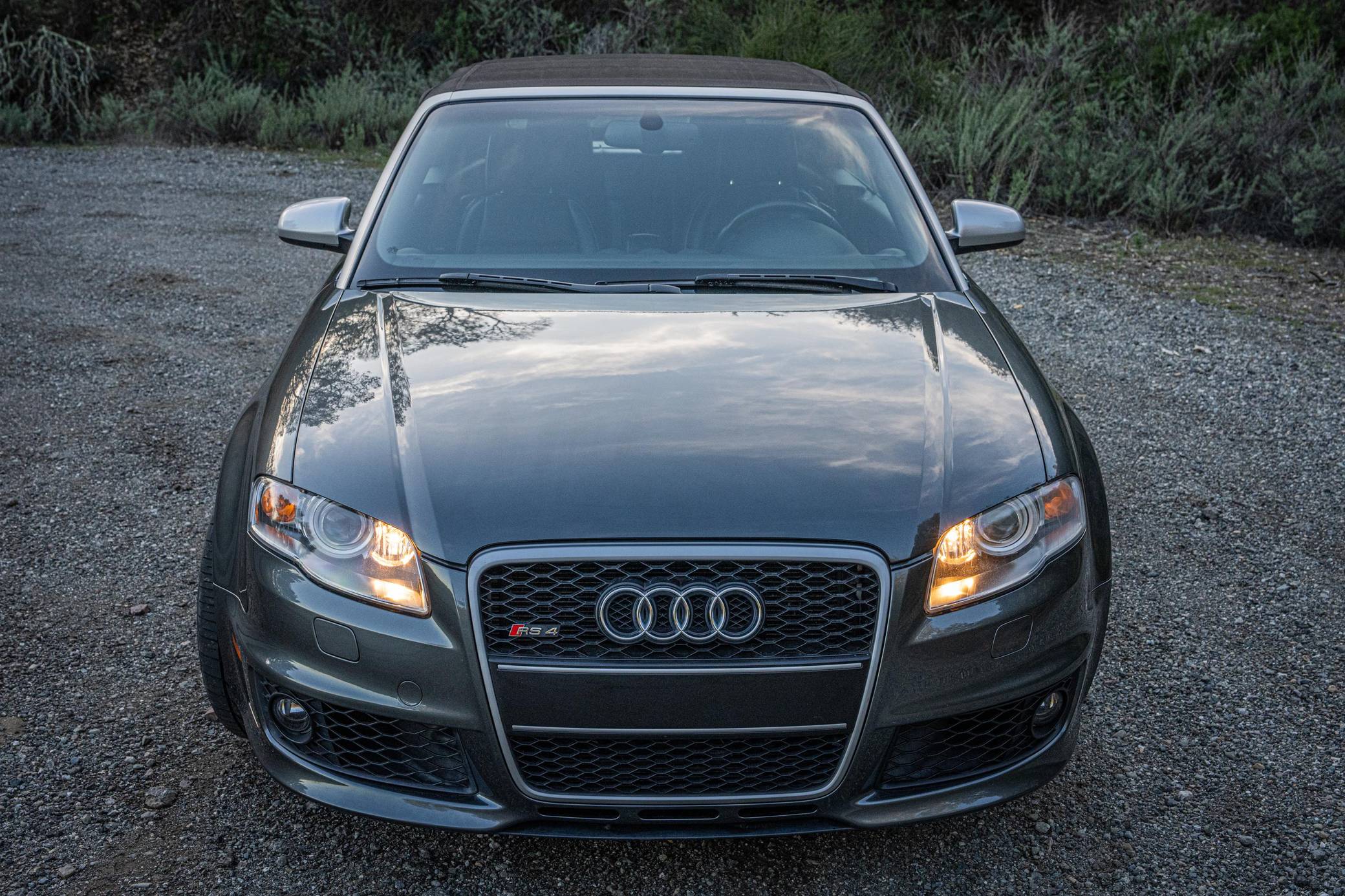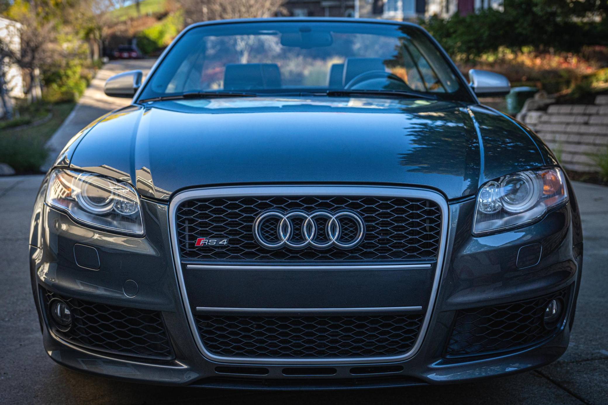 THIS… is a 2008 Audi RS4 Cabriolet, finished in Daytona Gray with a black interior. This RS4 is equipped with a 6-speed manual transmission, and its odometer currently displays about 45,600 miles. It also confirms that this is a one-owner car that's been registered in California from new. Factory equipment includes 19-inch alloy wheels, RS4-specific sport suspension, bi-xenon headlights, a power-retractable soft top, Silk Nappa leather upholstery, carbon fiber interior trim, heated front seats, a Bose premium sound system, and a navigation system. The seller reports no modifications. Audi sold the "B7" generation RS4 in the United States during the 2007 and 2008 model years. Offered as a sedan and as a convertible, both body styles were exclusively equipped with a 6-speed manual transmission. Audi hasn't made another RS4 available in America since, largely because the next two generations were only made as station wagons. Power comes from a 4. 2-liter V8, rated at 420 horsepower and 317 lb-ft of torque. Output is sent to all four wheels via a 6-speed manual transmission and Audi's Quattro permanent all-wheel drive system.