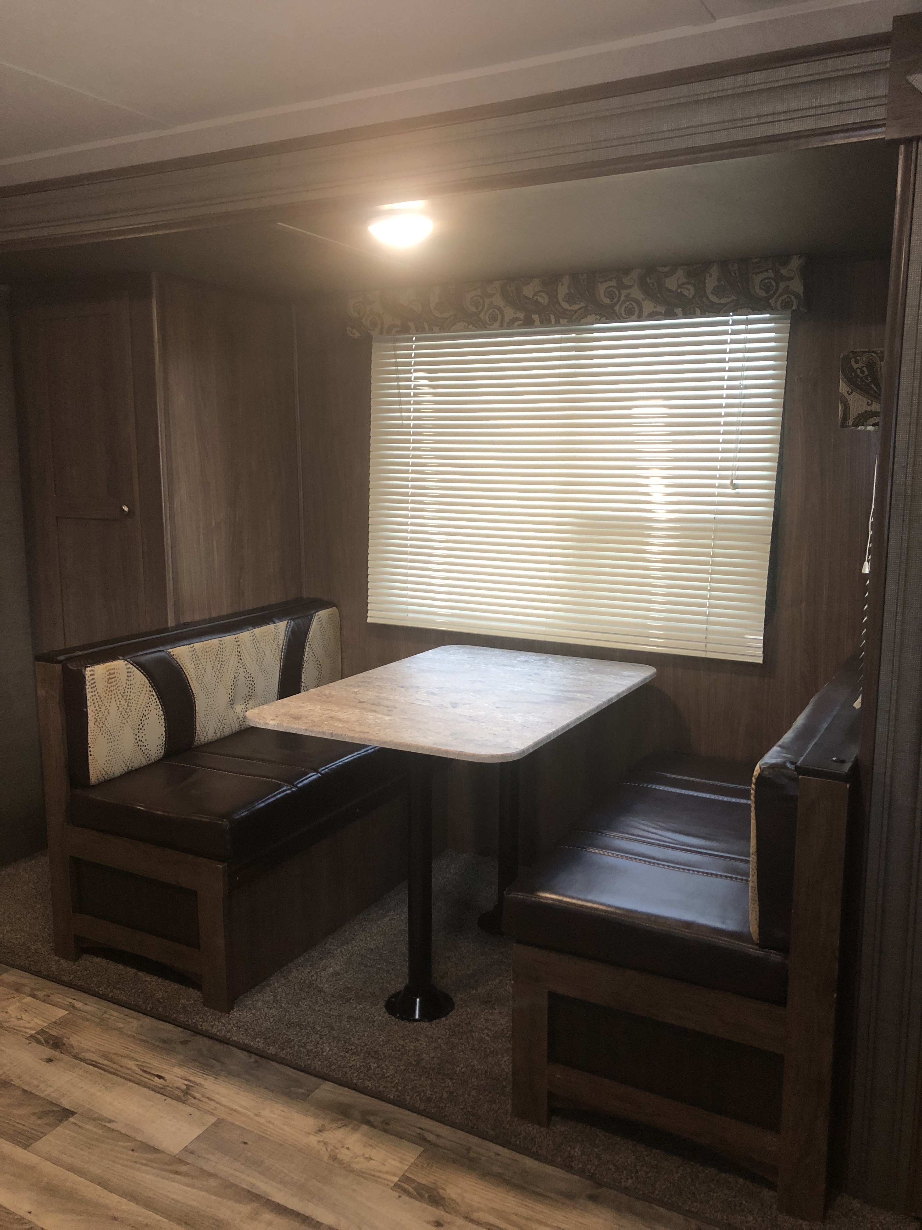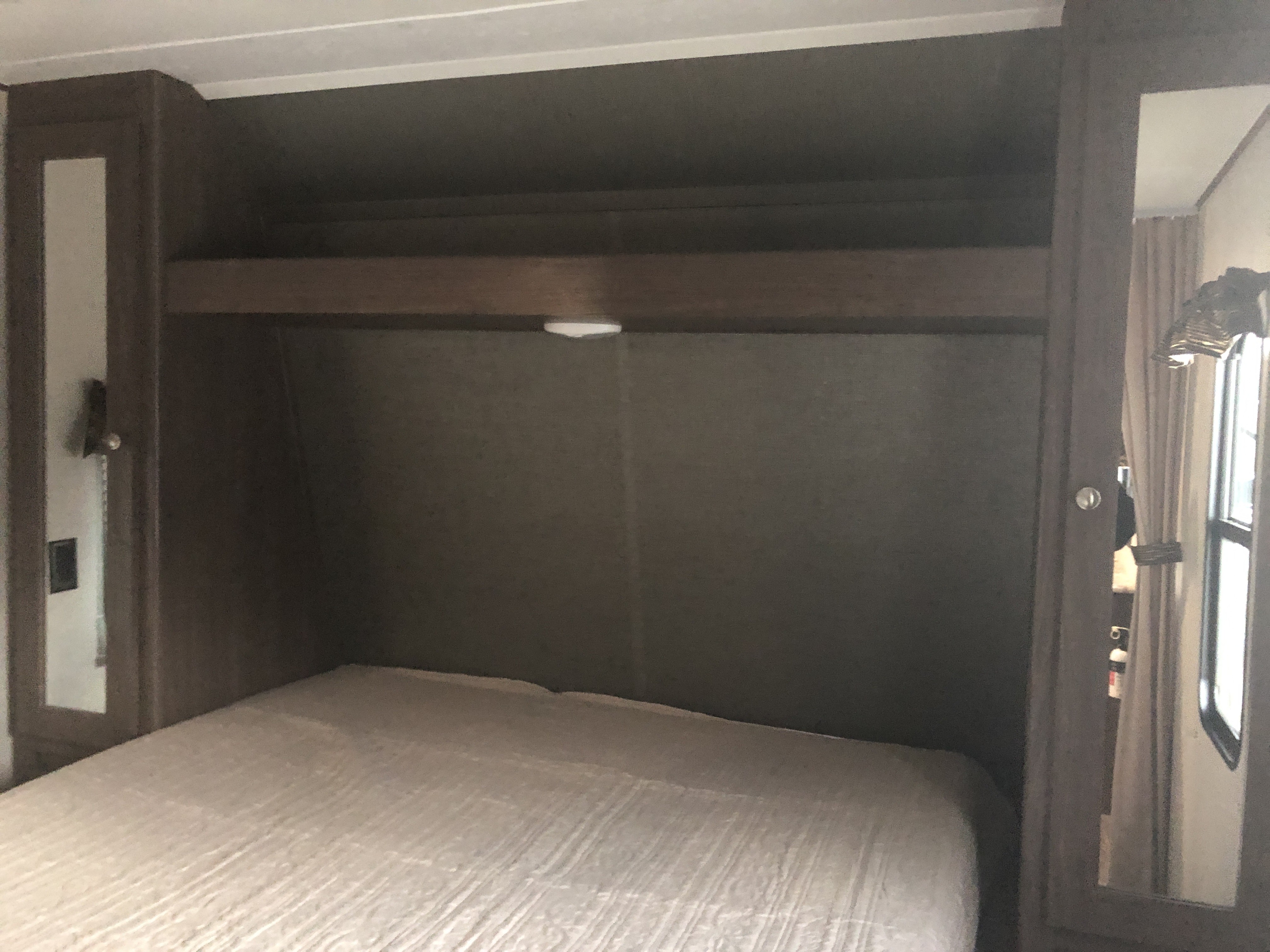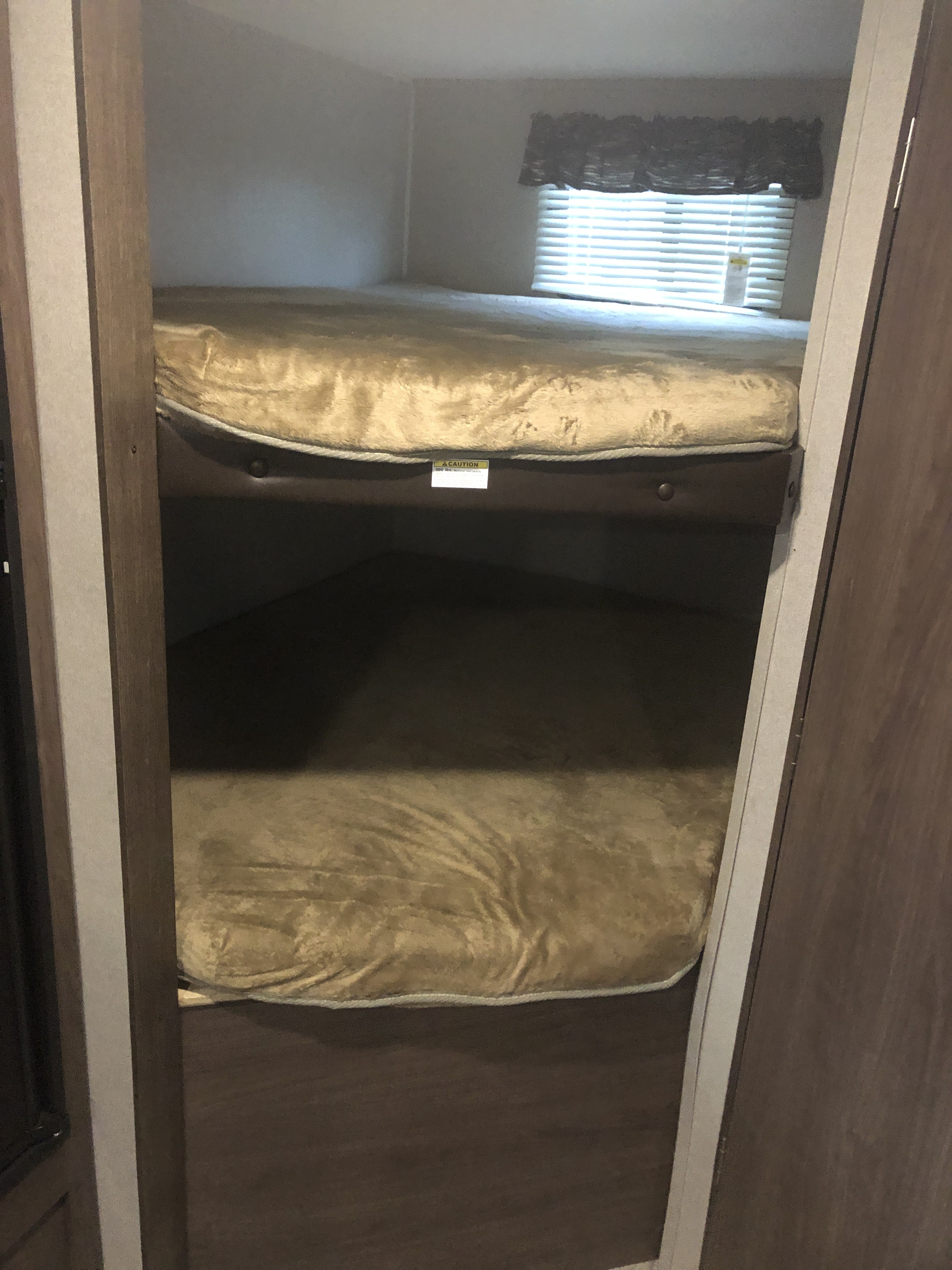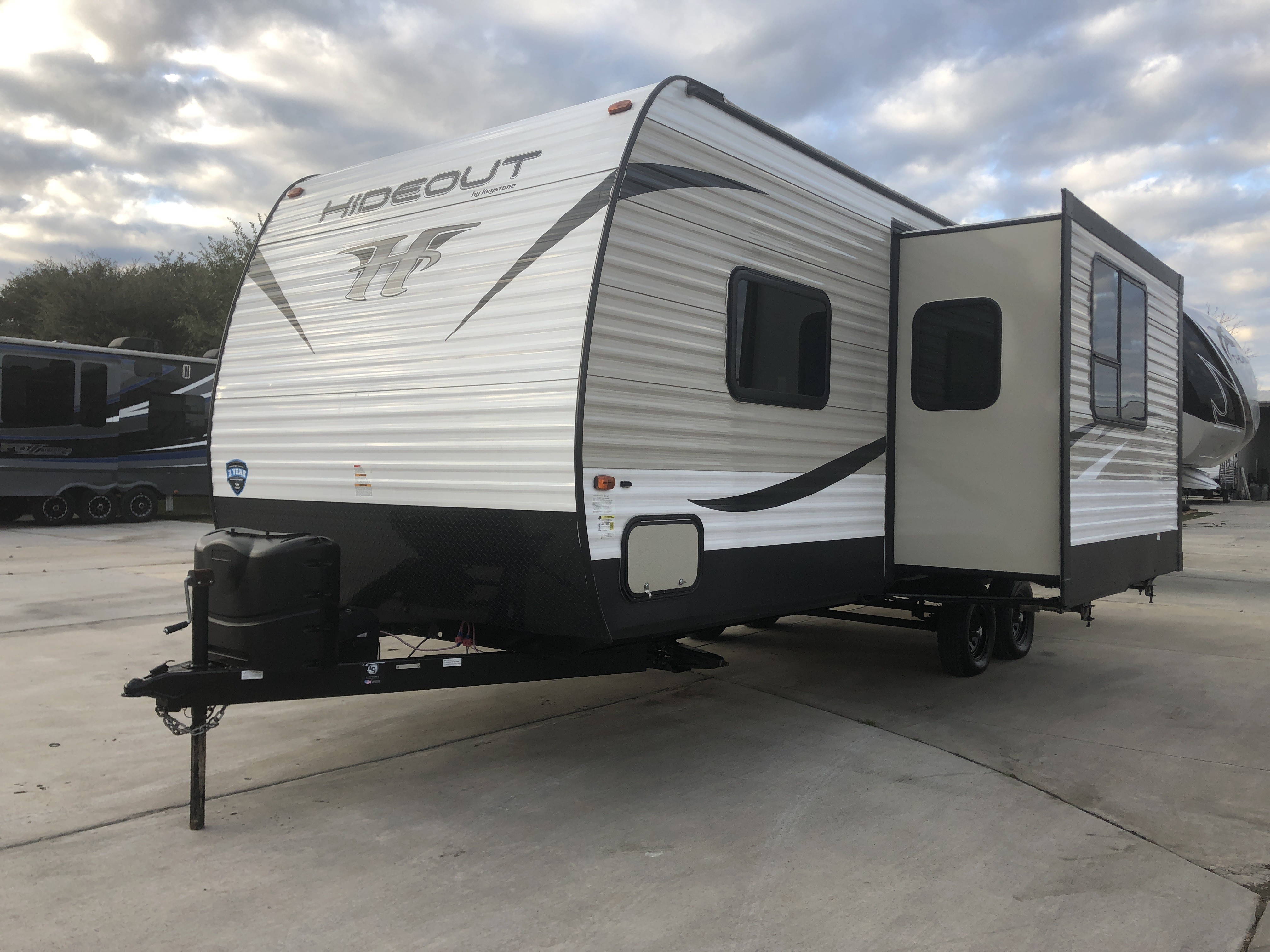 This 2017 Hideout Model 242LHS by Keystone is in EXCELLENT condition, very clean with bunk beds, master bedroom, full kitchen, full bathroom, self-contained, and sleeps 6 people comfortably. The kitchen is equipped with stainless steel microwave and 3 burner stove top with an oven, mid-size fridge, pantry, sink, booth dining that converts into a bed. Entertainment center with stereo CD/DVD/Radio, interior speakers, and exterior speakers. The master bedroom has a queen bed with under-storage, overhead storage, and 2 T-shirt closets. The 242LHS has a power patio awning, backup camera ready, central ducted air, exterior kitchen to prepare your meals outside so that you don't have to miss out on any of the fun, exterior storage, and a spare tire and carrier.