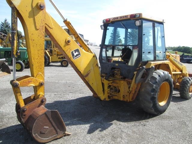1988 John Deere 210C backhoe, hp 55, 4WD, cab, heat, std hoe, 36" rear bucket, 16.9-24 rear tires, 12-16.5 front tires, 91" front bucket, 4 cyl John Deere diesel, 2 lever backhoe controls, 4-speed shuttle trans, digs 14' deep, weighs 11,500lbs, runs and operates great.