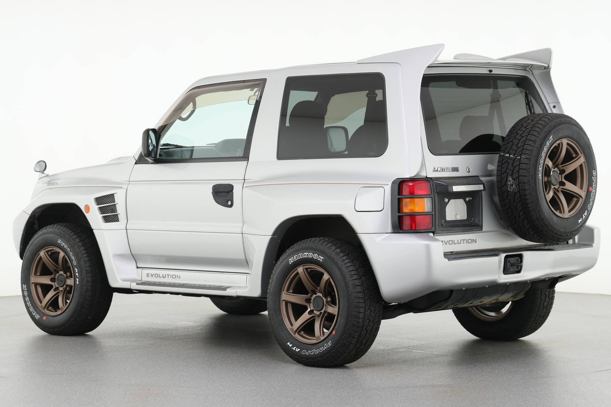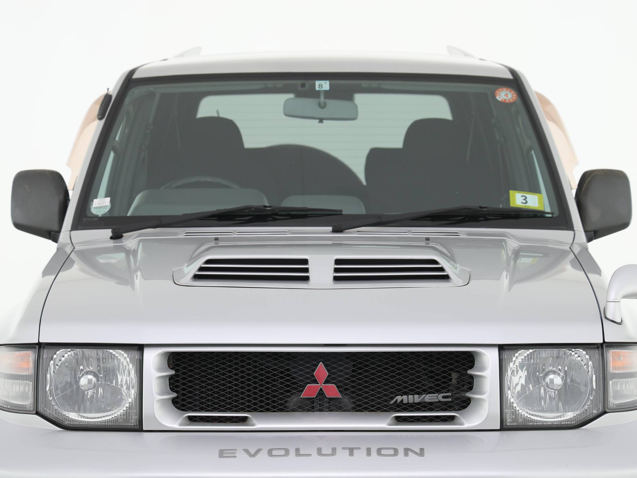 1997 Mitsubishi Pajero Evolution, finished in silver with a black interior. Reportedly imported in 2022, it's equipped with a metric instrument cluster and its odometer displays about 169,800 kilometers, which represents approximately 105,500 miles. Factory equipment includes a locking center differential, skid plates, an Evolution-specific body kit, a trailer hitch, Recaro front sport seats, an information display on the dashboard, and air conditioning. Modifications reported by the seller include 17-inch Enkei Cyclone wheels, a Kenwood CD player, and a Japanese toll card reader. Mitsubishi released the Pajero Evolution in 1997 to homologate the SUV in the Dakar Rally. Starting with the short-wheelbase model, the company added a full body kit characterized by wheel arch flares, an all-around independent suspension system, a quicker steering system, and a more powerful engine, among other rally-inspired changes. Its efforts paid off: the Pajero took first, second, third, and fourth in the 1998 Dakar. Most historians agree that approximately 2,500 street-legal Evolution models were built. Power comes from a 3. 5-liter V6, rated at about 276 horsepower and 257 lb-ft of torque. Called "6G74" internally, it spins the rear or the four wheels via a 5-speed automatic transmission and a 2-speed transfer case.